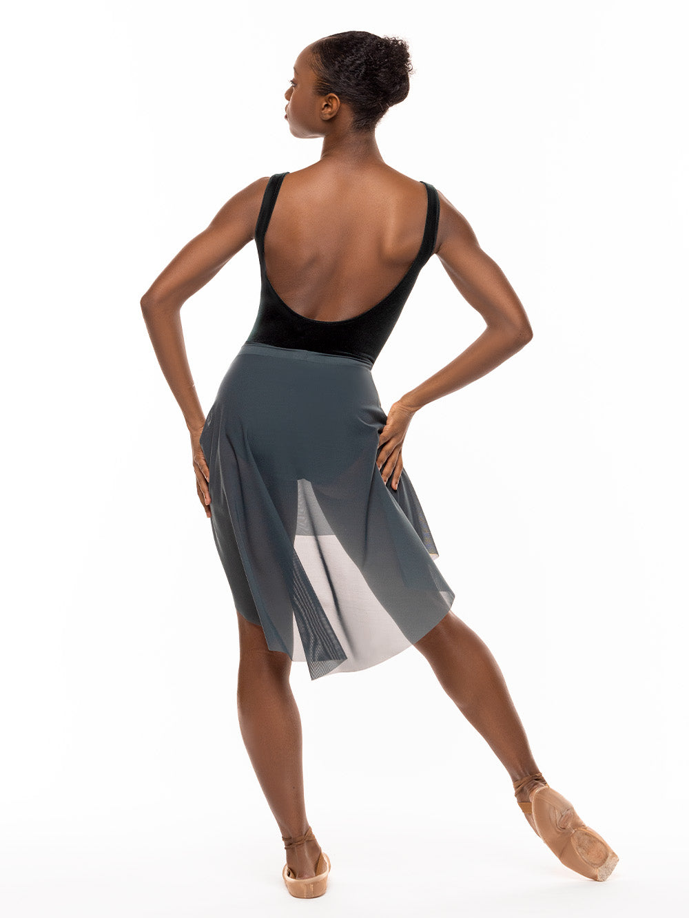 Model 1 is wearing Allison Leotard Dark Forest Velvet RTW with Dramatic High-Low Skirt Dark Forest Mesh RTW in size Adult XS.