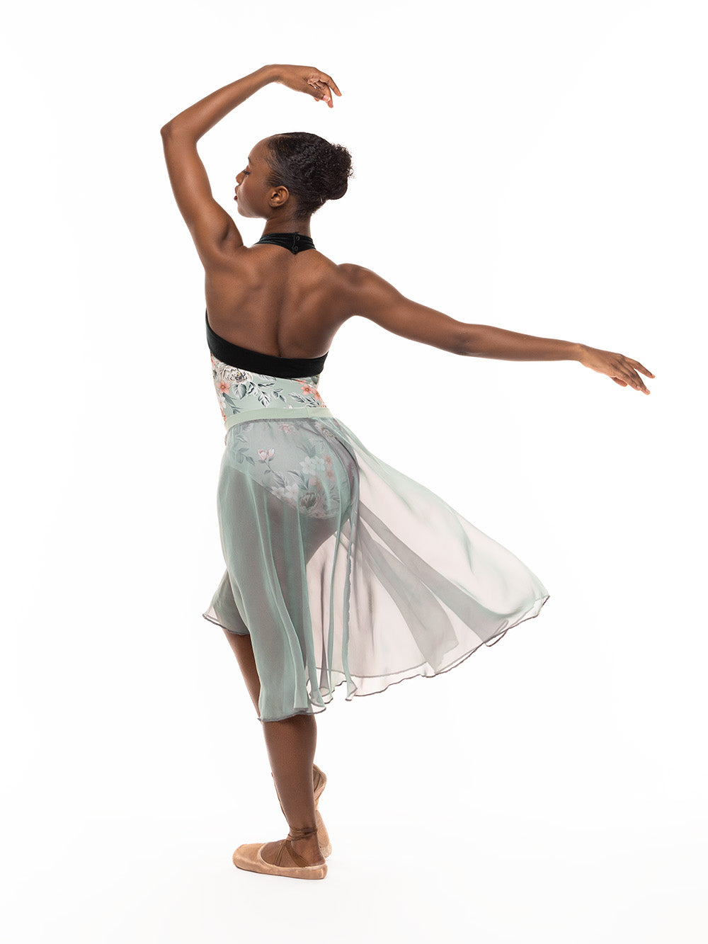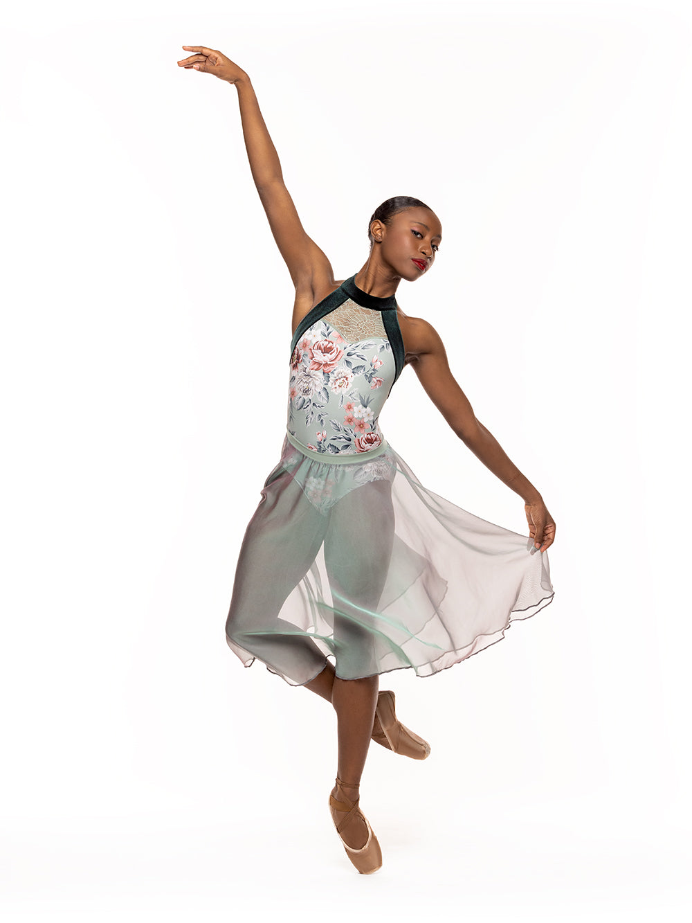Model 2 is wearing both leotard and Chiffon Rehearsal skirt in size Adult XS.