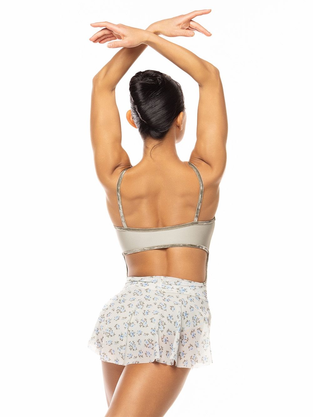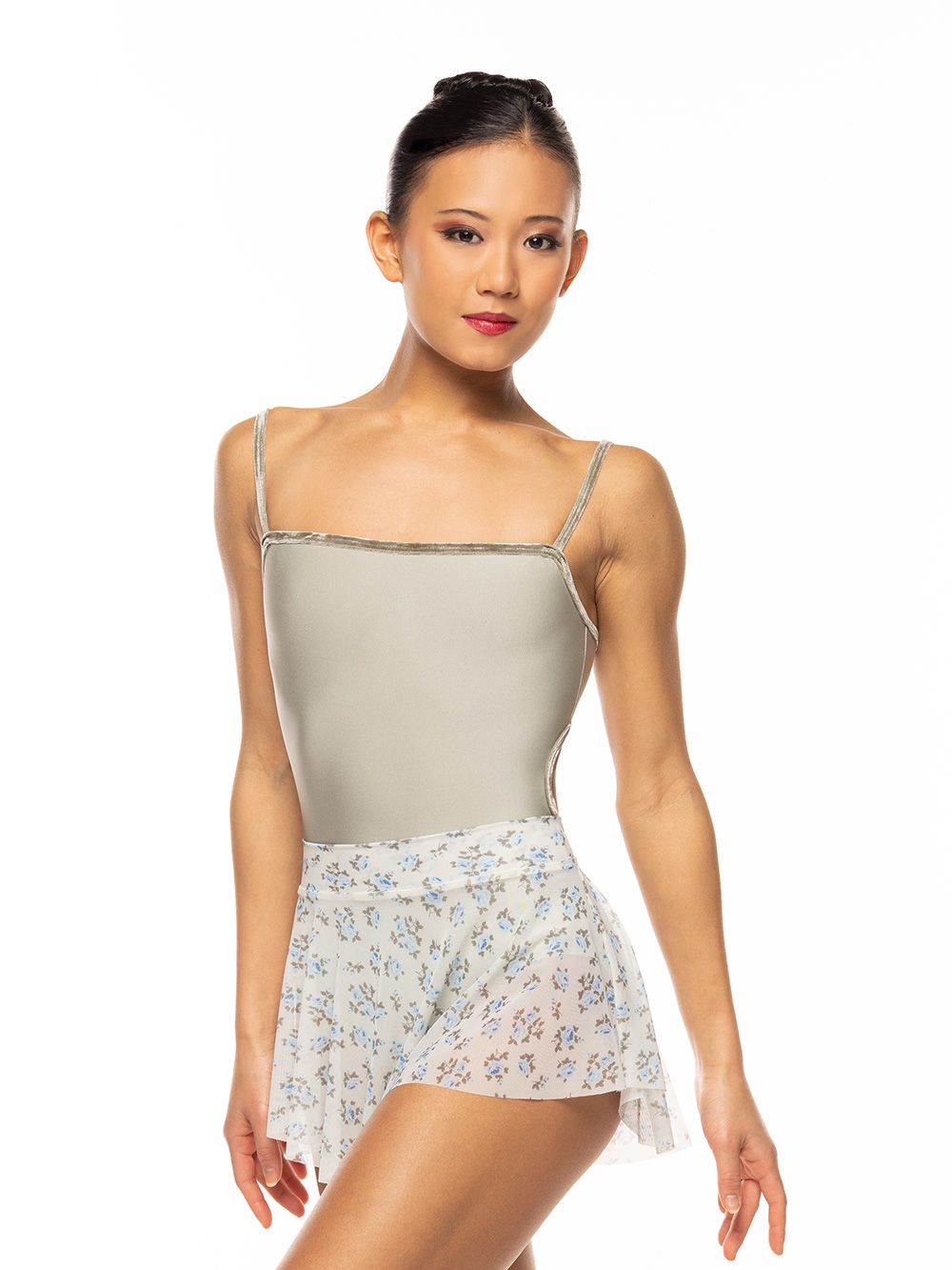 Model 1 is wearing a leotard, skirt, and crop top in adult size S.