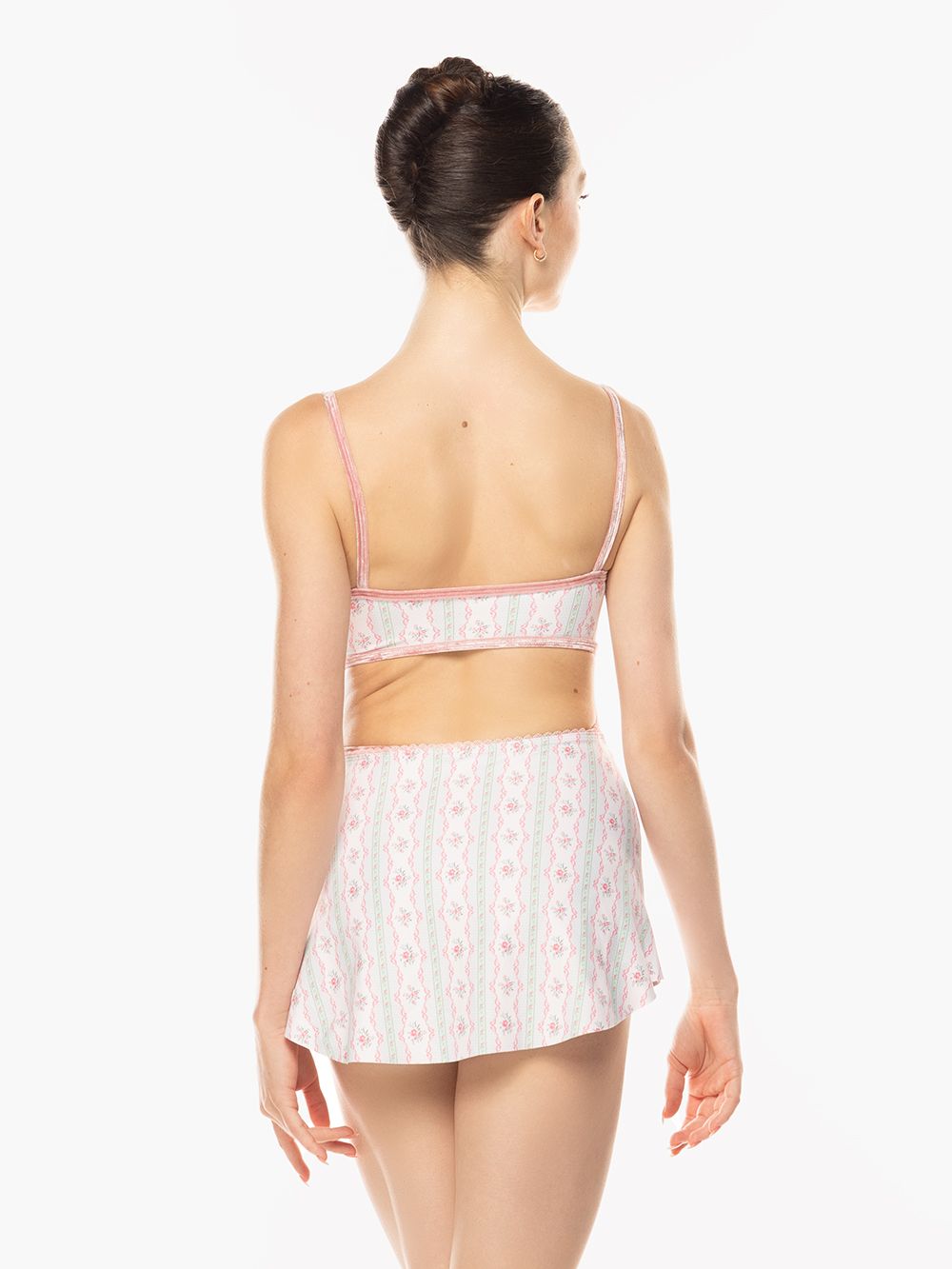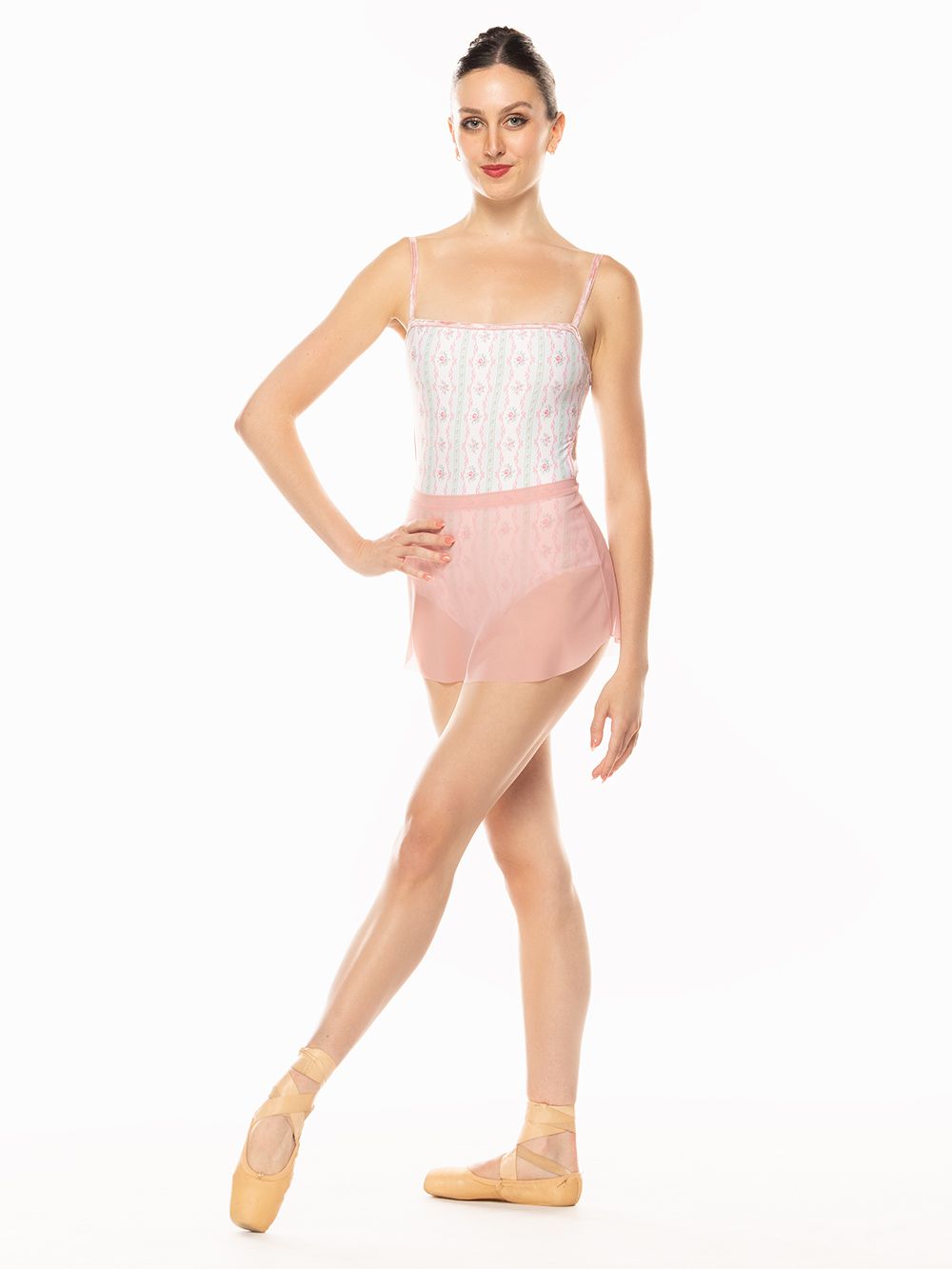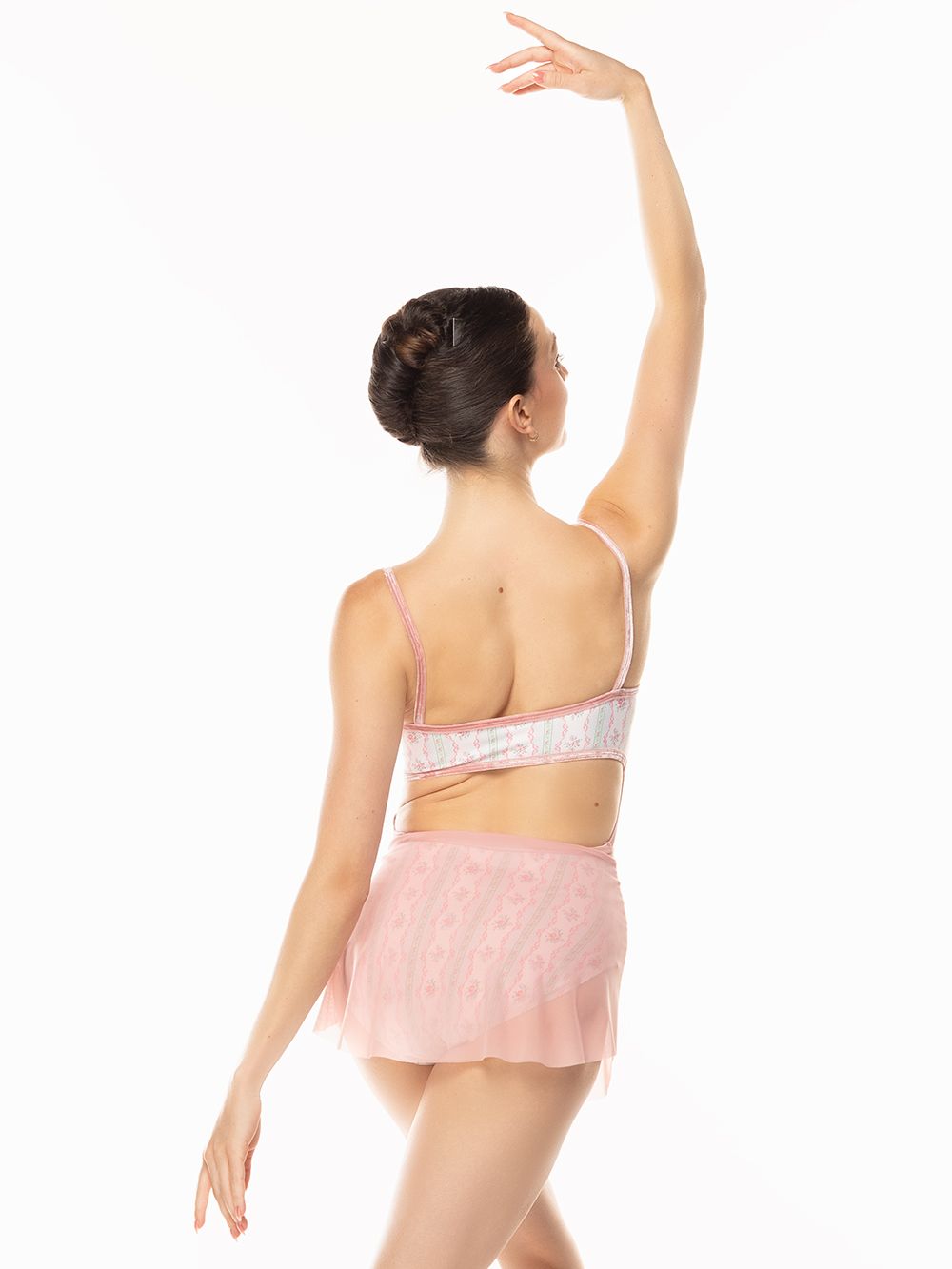 Model is wearing a leotard, crop top, and skirt in adult size XS.