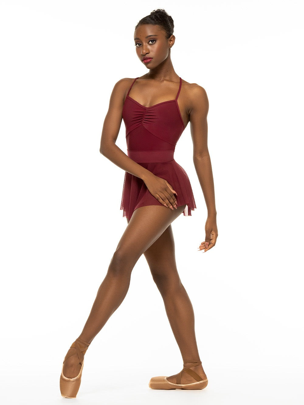 Model 1 is wearing Hipster Skirt Wine Mesh RTW in size Adult X-Small with Fabiola Leotard Wine RTW.