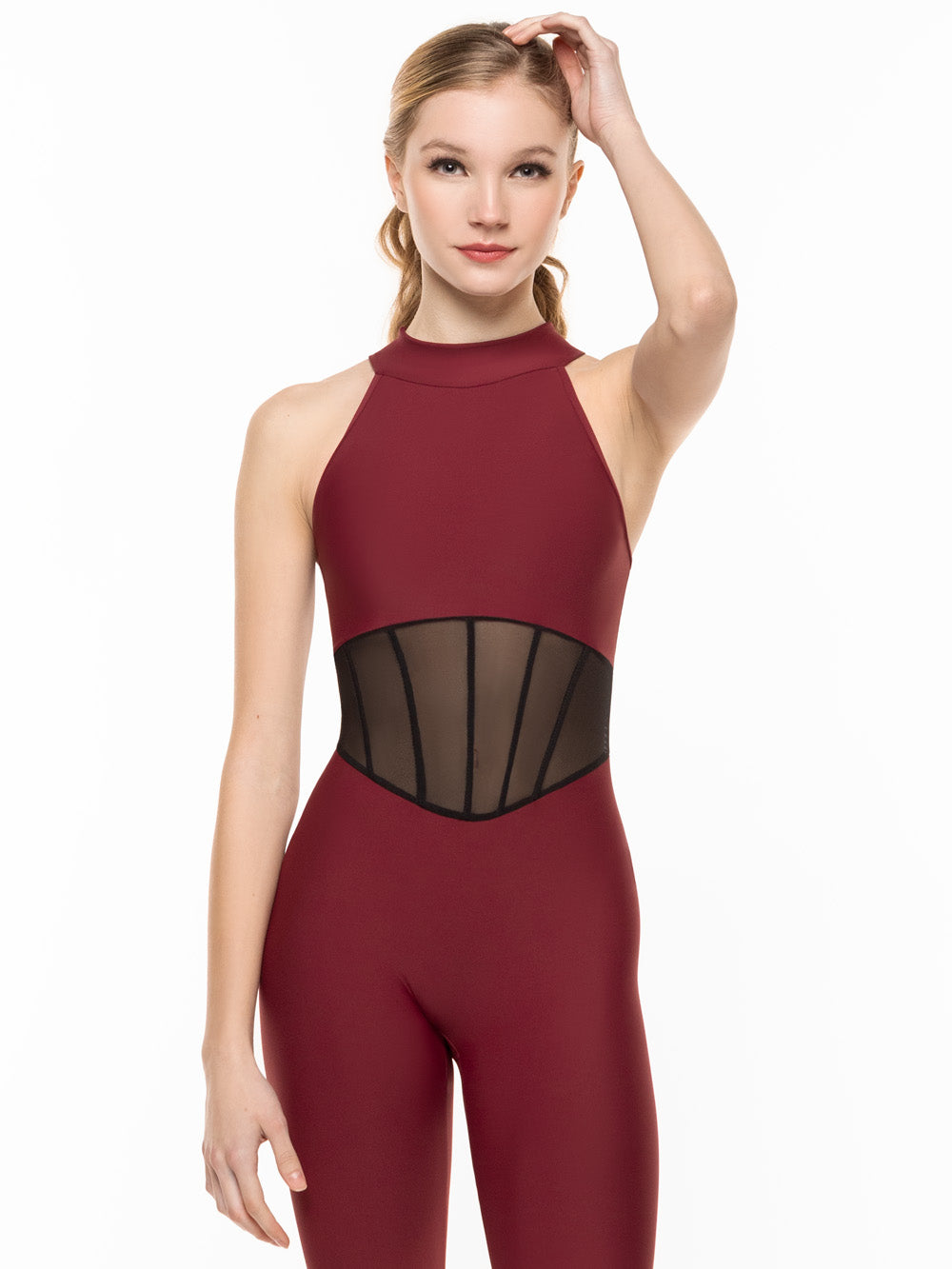 Introducing the Kiki Unitard, a captivating design that will instantly draw the eye! This on-trend onesie features a high collared neck, corseted mesh middle, and open snap back. Now available in soft Burgundy Wine with Black Mesh.