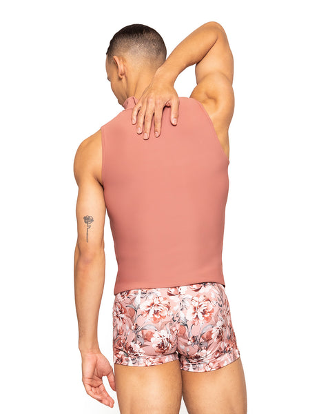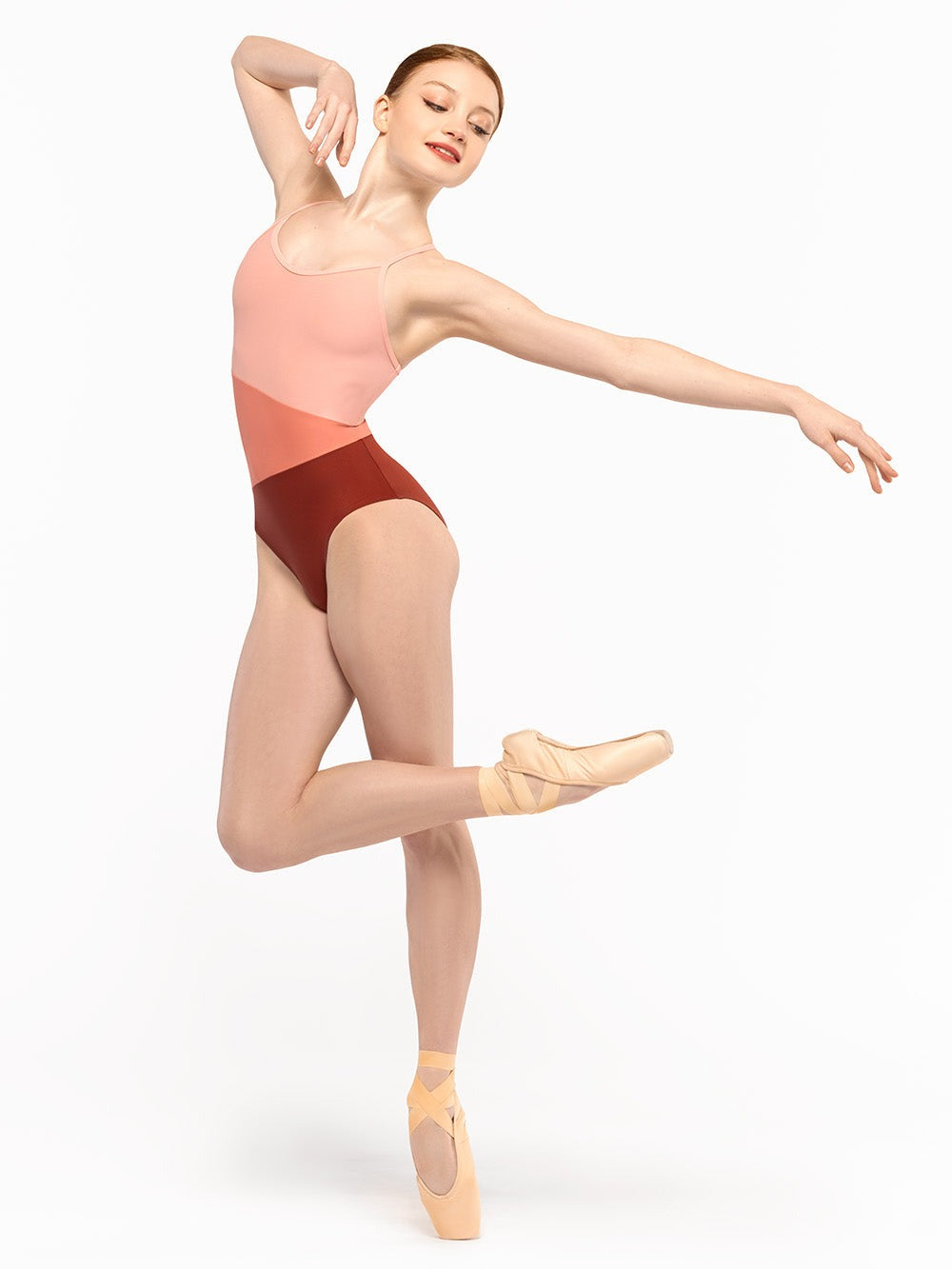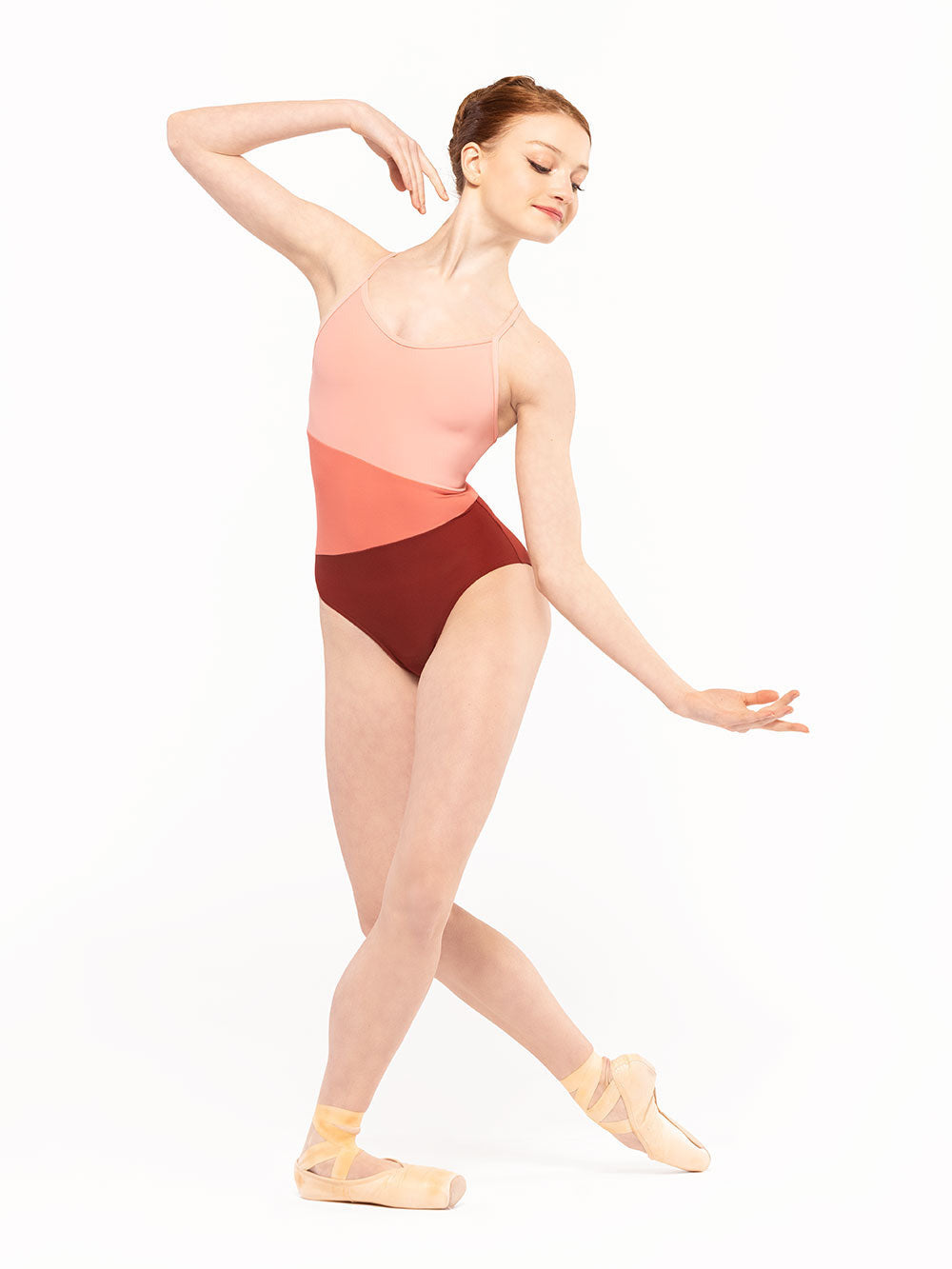 Discover the Tina Leotard, now in a stunning sunset colorway. This leotard features a front V neckline and racer back, paired with unique asymmetrical color blocking that showcases our Blossom, Sunset, and Mars fabrics. Pair it with our Hipster Skirt Mars Mesh RTW for the perfect fusion of sporty design and sophisticated style!