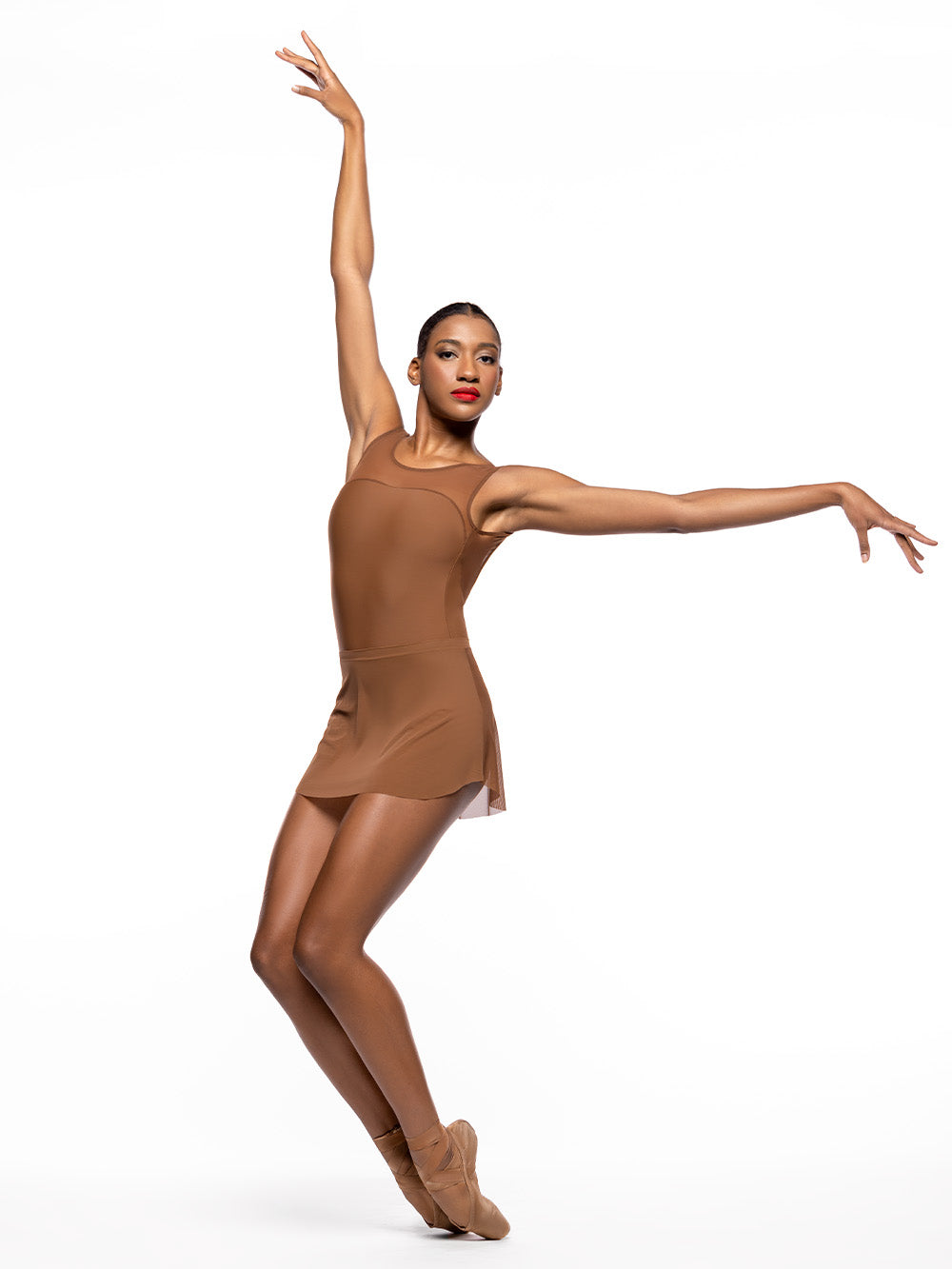 Model is wearing Victoria Mocha Leotard in size Adult Medium with Long High-Low Skirt Mocha Mesh RTW.