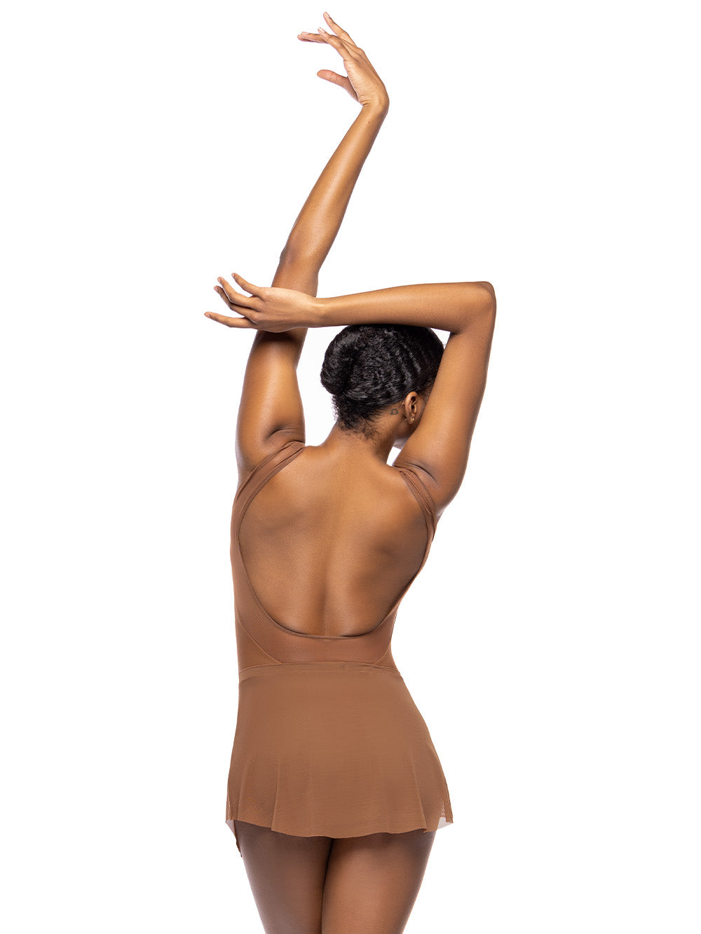A twist on a classic look! The tank-style Victoria leotard features a high neck and plunging mesh back, now available in a Mocha Matte base and matching Mocha Mesh.