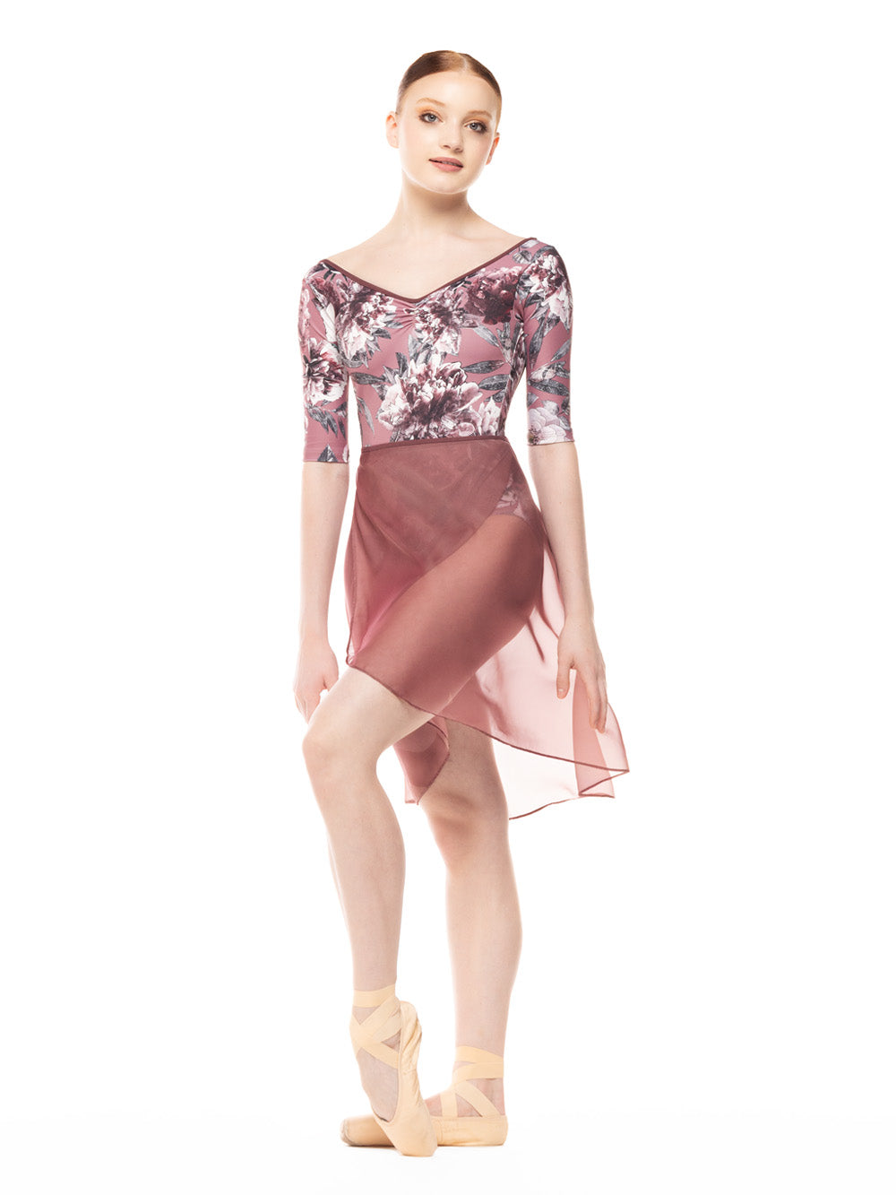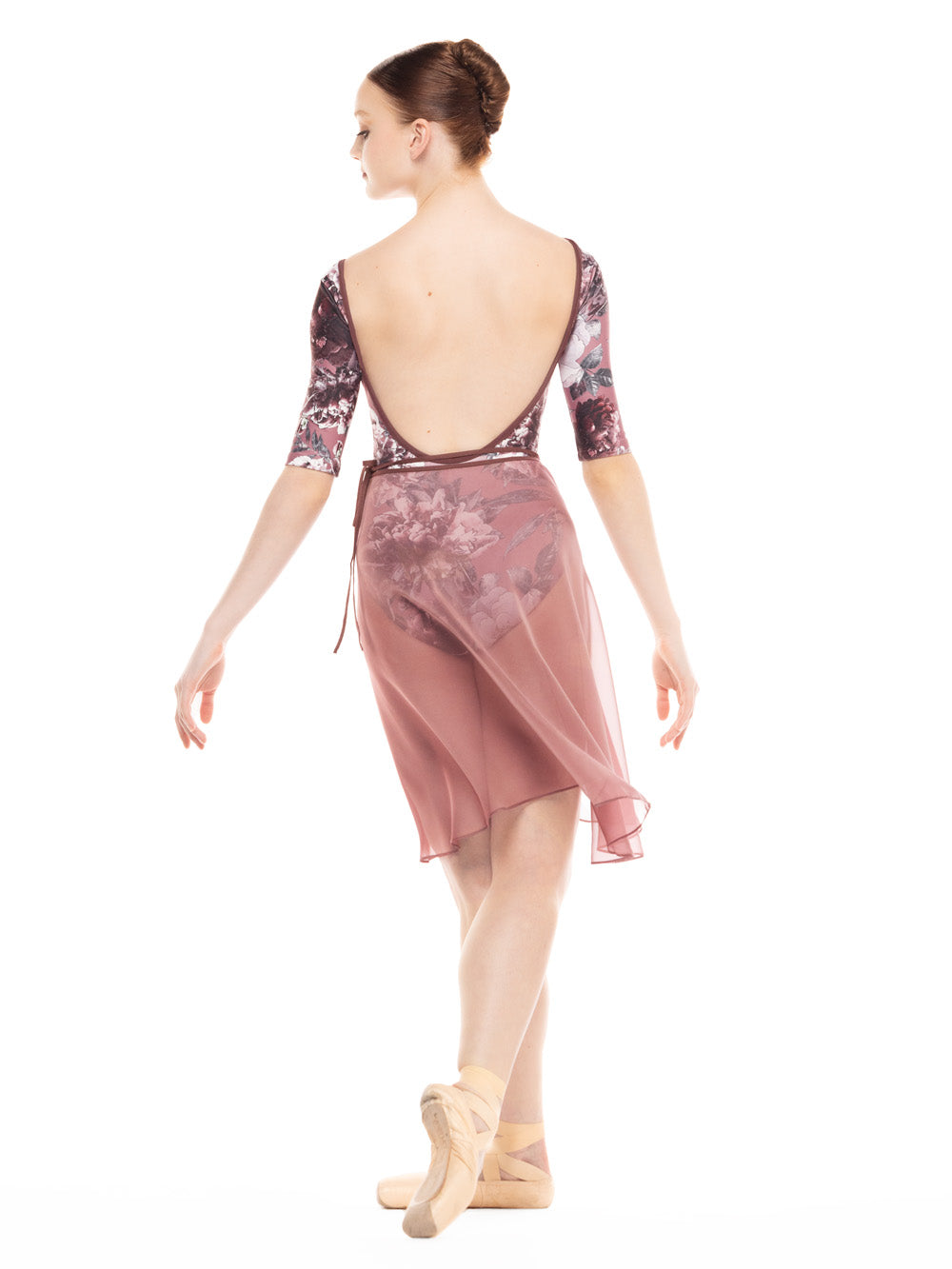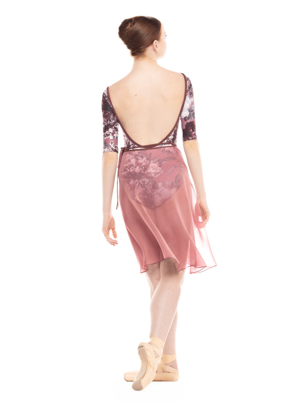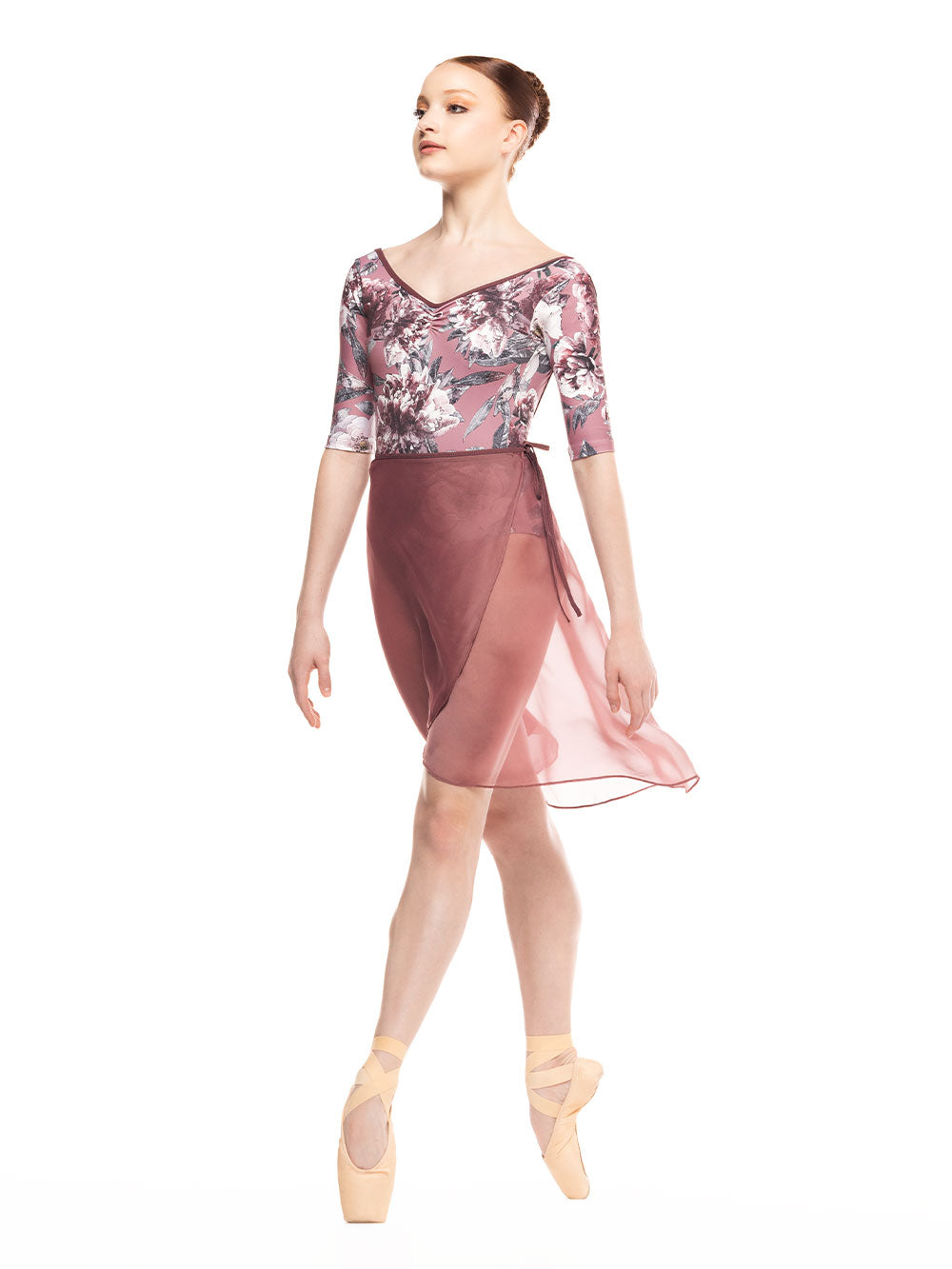 Model is wearing Stella Dark Romance Mink leotard and skirt in Adult XS.