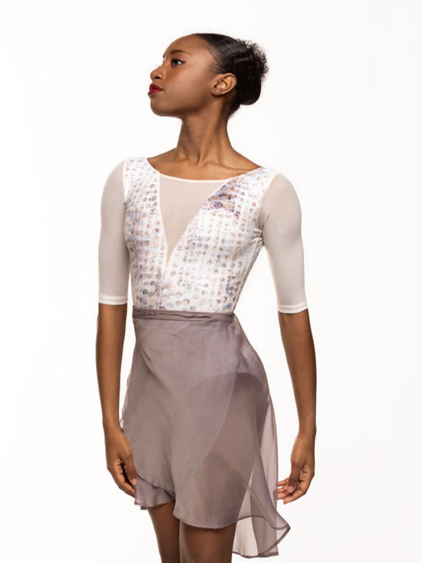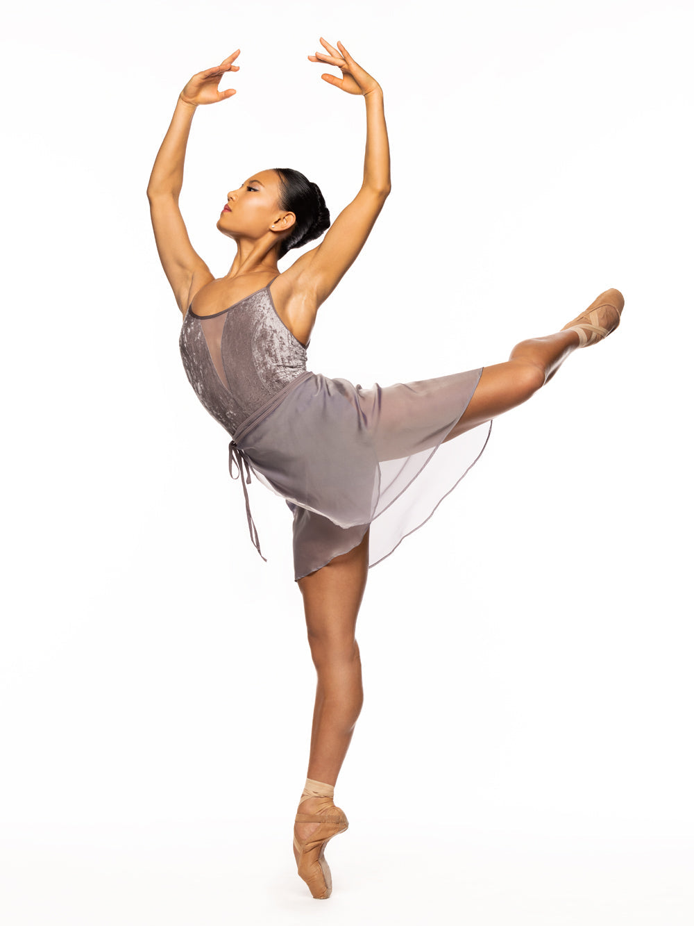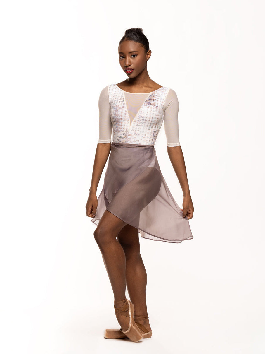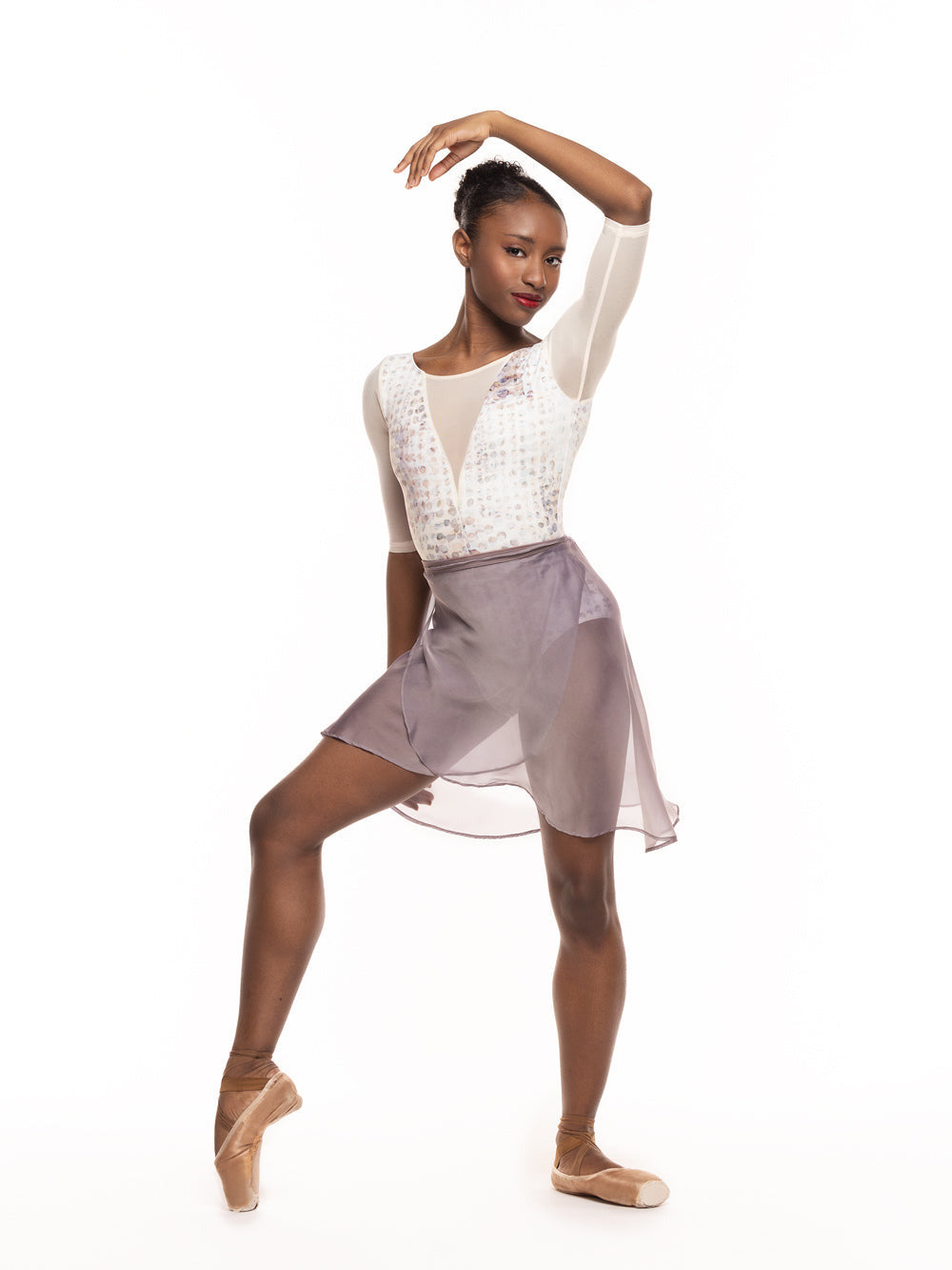 Model 1 is wearing leotard and skirt in Adult size XS, and Shrug and Thigh High Leg Warmers in XS/S.