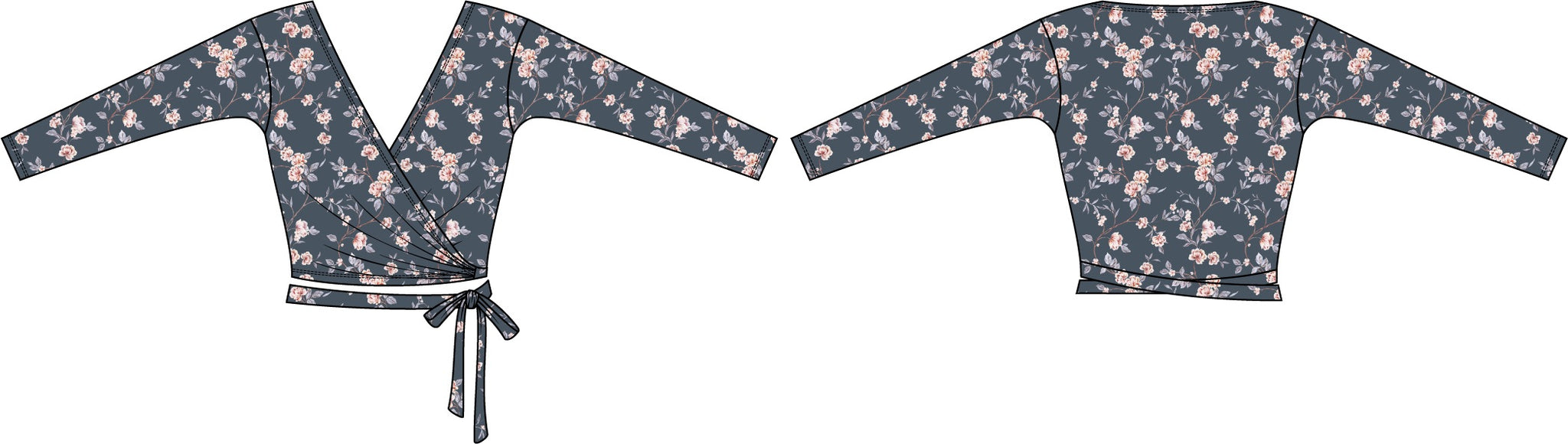 Wrap yourself in moody flora with our Wrap Top Flourish Storm Mesh! Wear this versatile dancewear piece as a cover up in class, on stage, or day-to-day with your favorite jeans. Wear over your leo, and add a layering effect over one of our crop tops!