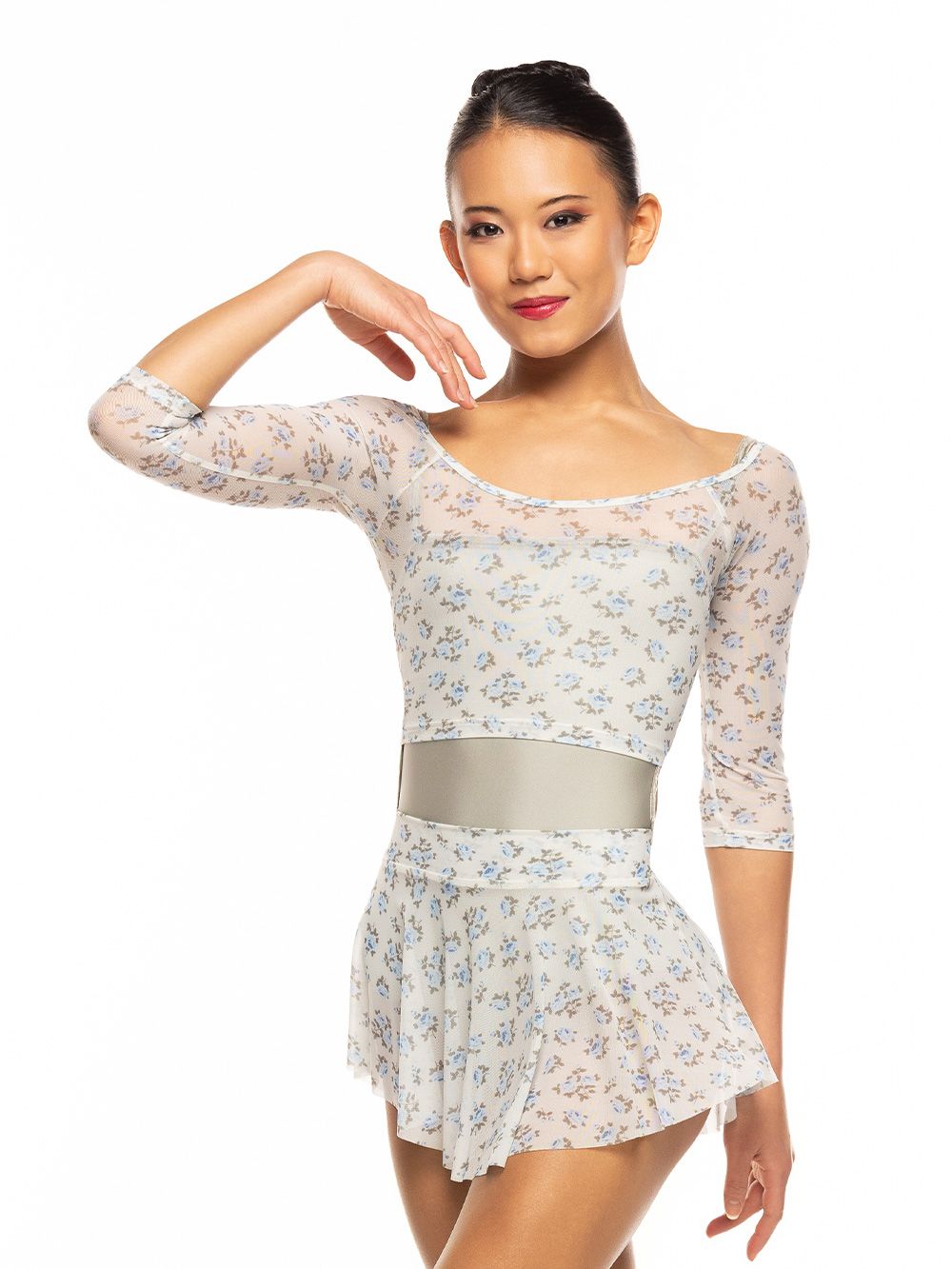 Model 1 is wearing a leotard, skirt, and crop top in adult size S.