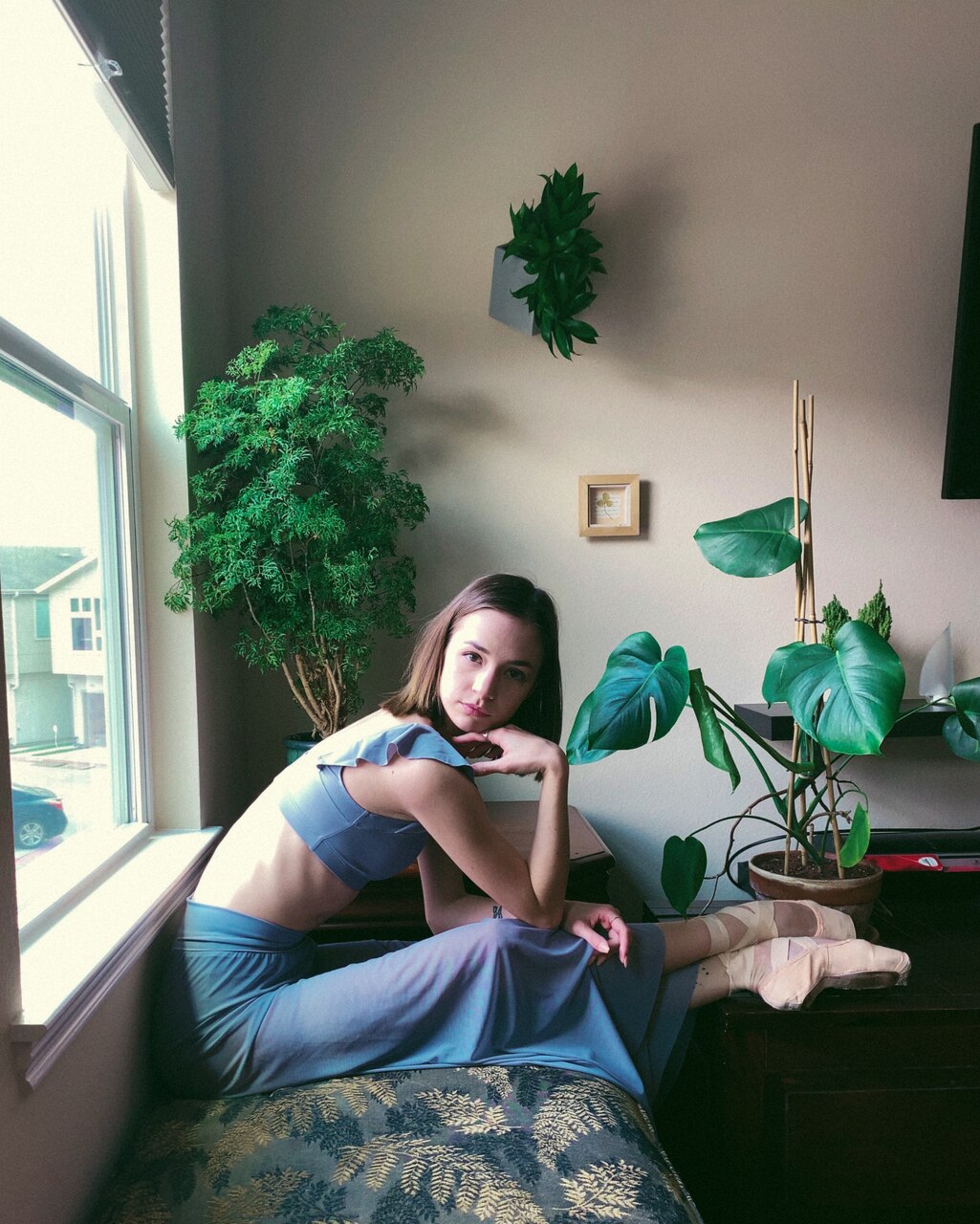 Model 2 is wearing M-34 Periwinkle Mesh Base and Waistband in the 26" Inseam option paired with our Ellen Crop Top and Dana Briefs. Color is off due to photo filter.