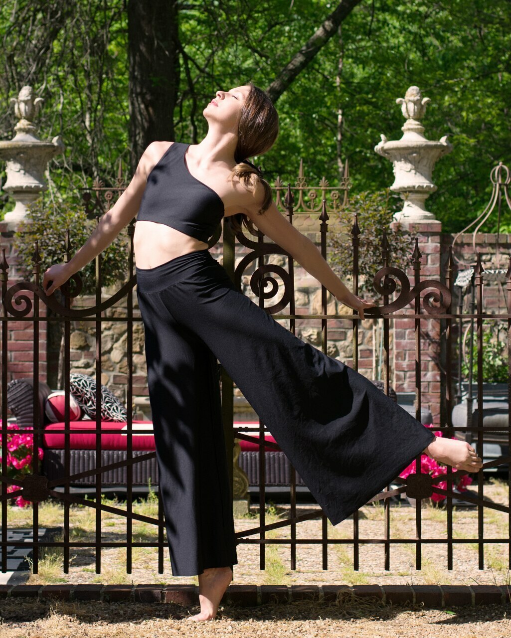 - Model 4 is wearing T-59 Tactel Black Base and Waistband in the 28" Inseam option paired with our Tori Crop Top Tactel Black RTW and Black Mesh Headscarf RTW.