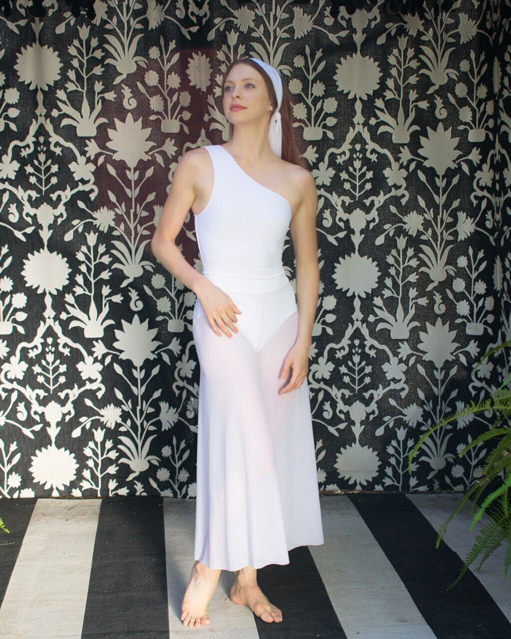 Model 3 is wearing M-1 White Mesh Base and Waistband in the 26" Inseam option paired with our Tori Tactel White RTW and White Dot Mesh Headscarf RTW.