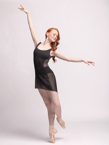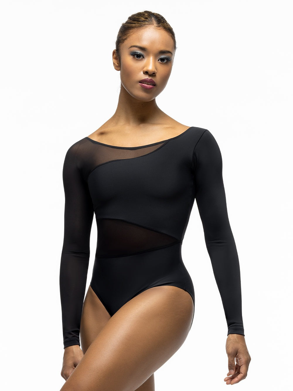 The contemporary Amelie has contrasting solid and mesh full length sleeves and a wrap around mesh waist detail. Available in classic Black Matte with Black Mesh.