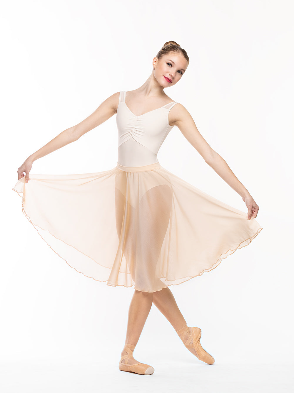 Model is wearing leotard in adult size XS and skirt in adult size S.