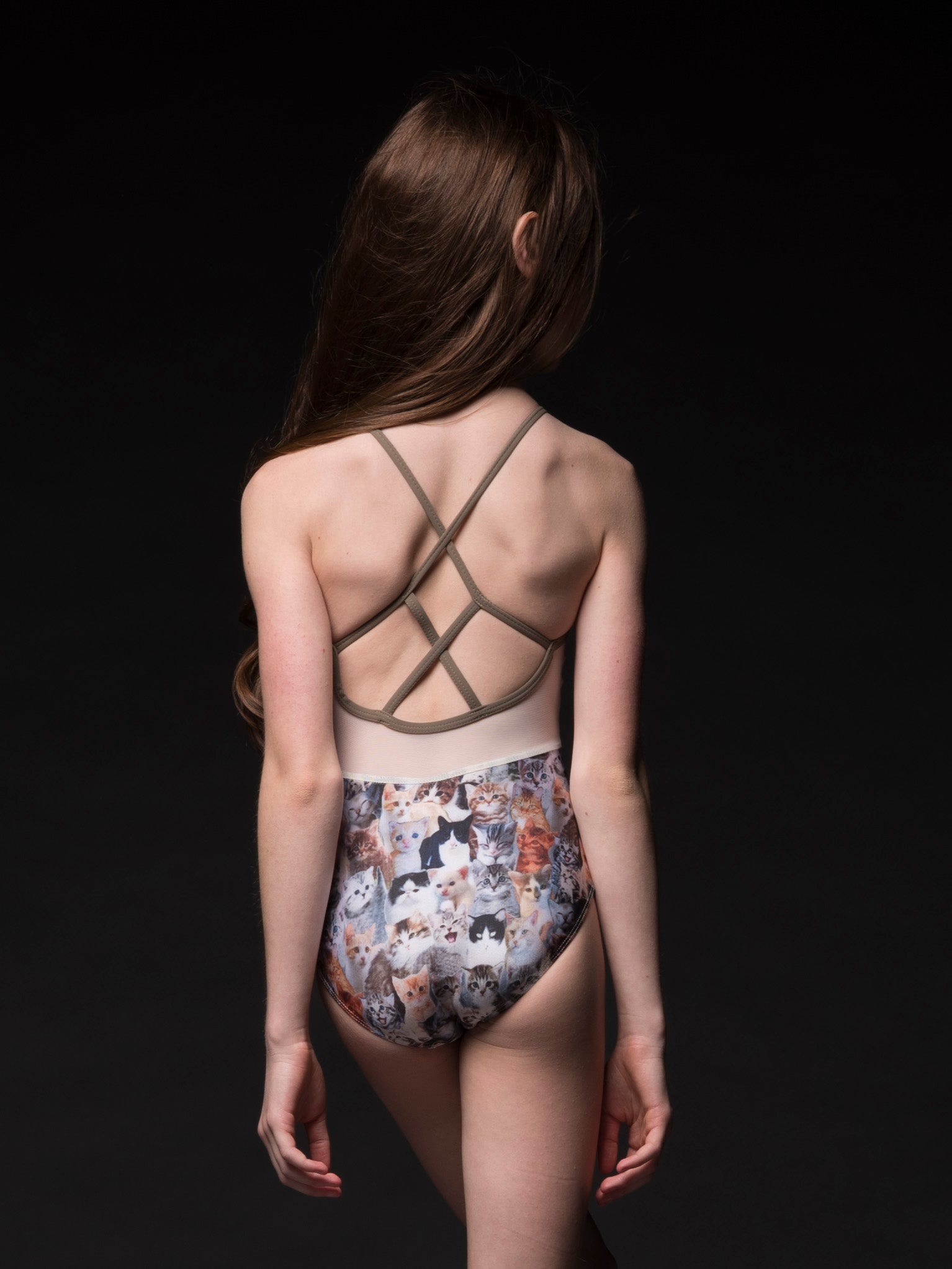 This darling leotard has a double criss-cross back and a higher front neckline. Choose from our lovely selection of fabrics to make this leotard uniquely yours.