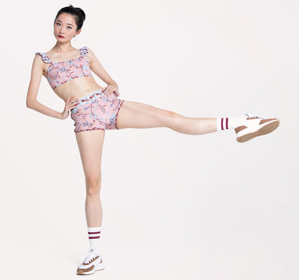 Feminine ruffle straps in Azila accent this Crescendo Pink crop top, combined with Vivaci Mars Trim. Pair it with Abby Shorts Crescendo RTW or Carmen Tights Crescendo RTW to complete your look!