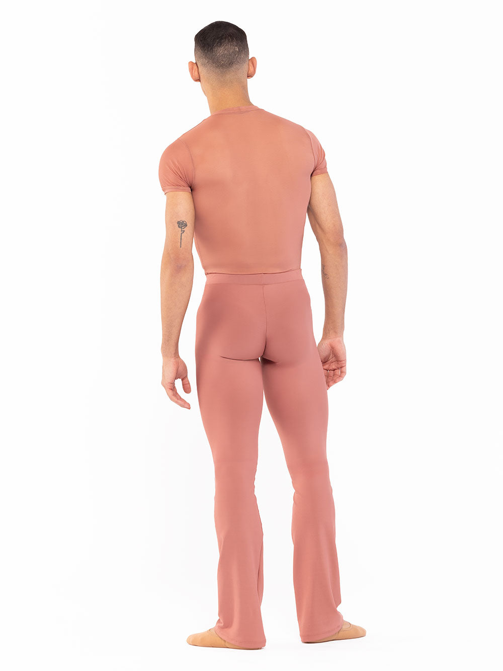 Model 4 is wearing the Gabe Leotard in size Adult Small featuring Short Sleeves and M-60 Sandstone Mesh Base, Trim, and Sleeves, paired with the Kam Pants in Soft Sandstone.
