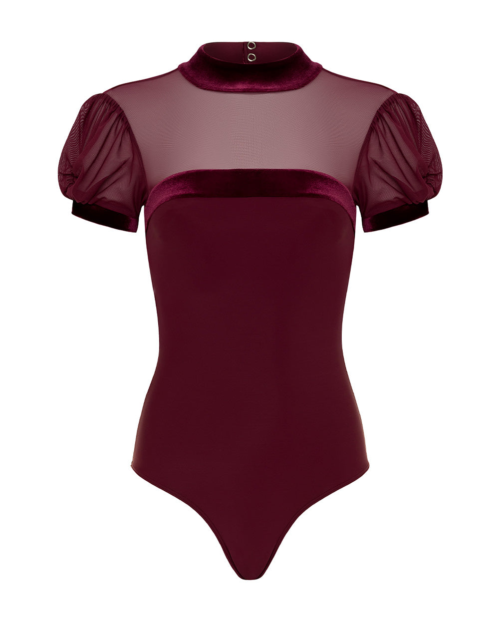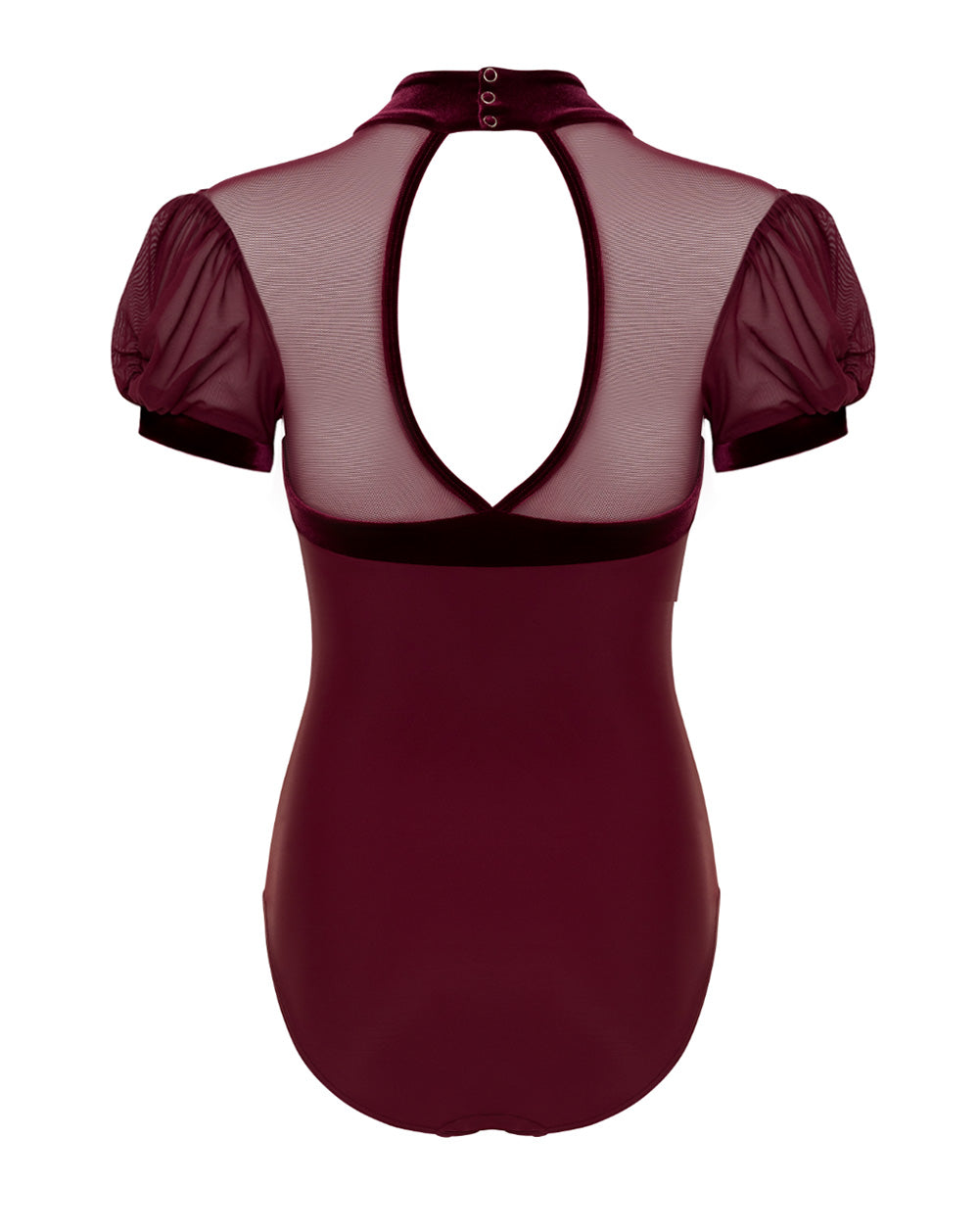 This elegant leotard features puff sleeves, a high neckline, and a front panel for a vintage-inspired silhouette. A keyhole back adds a graceful touch, perfect for dancers who love timeless style with modern flair.