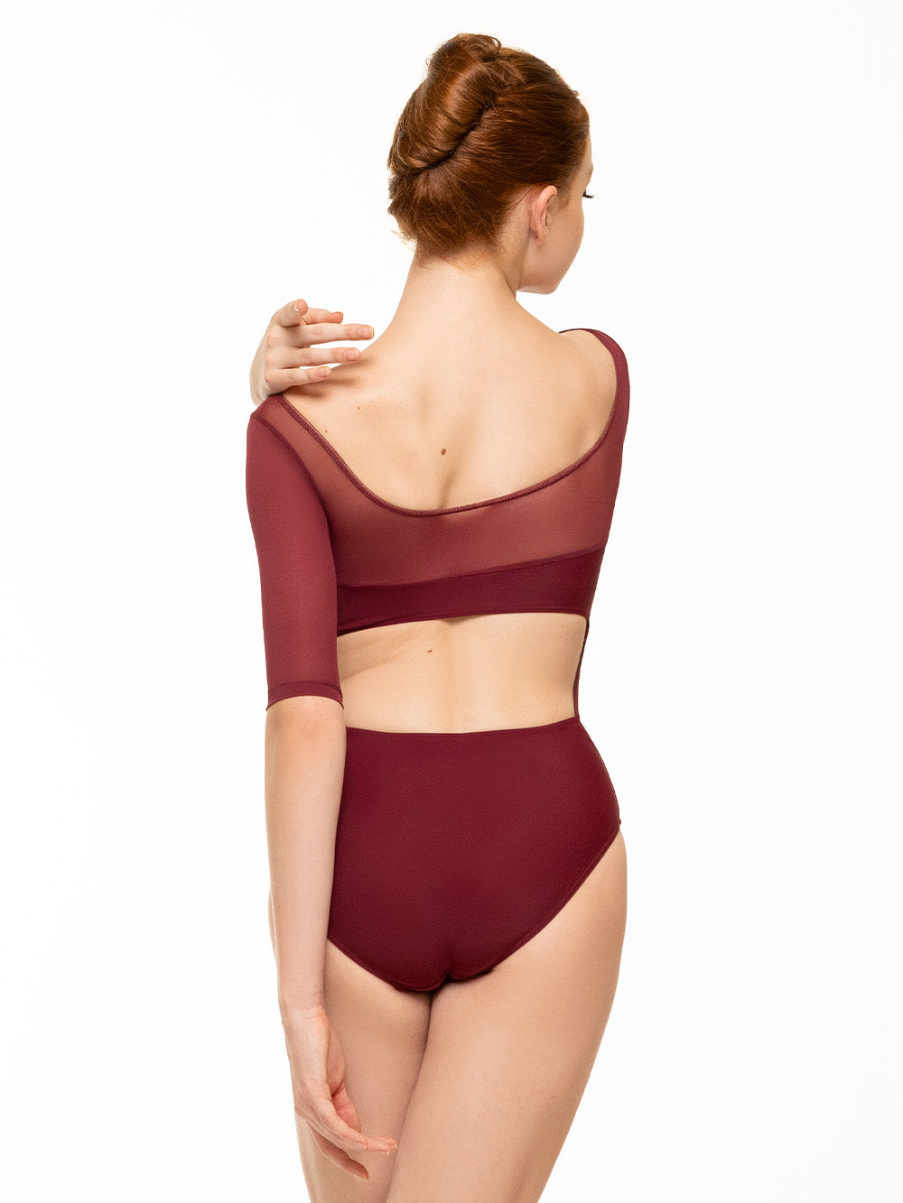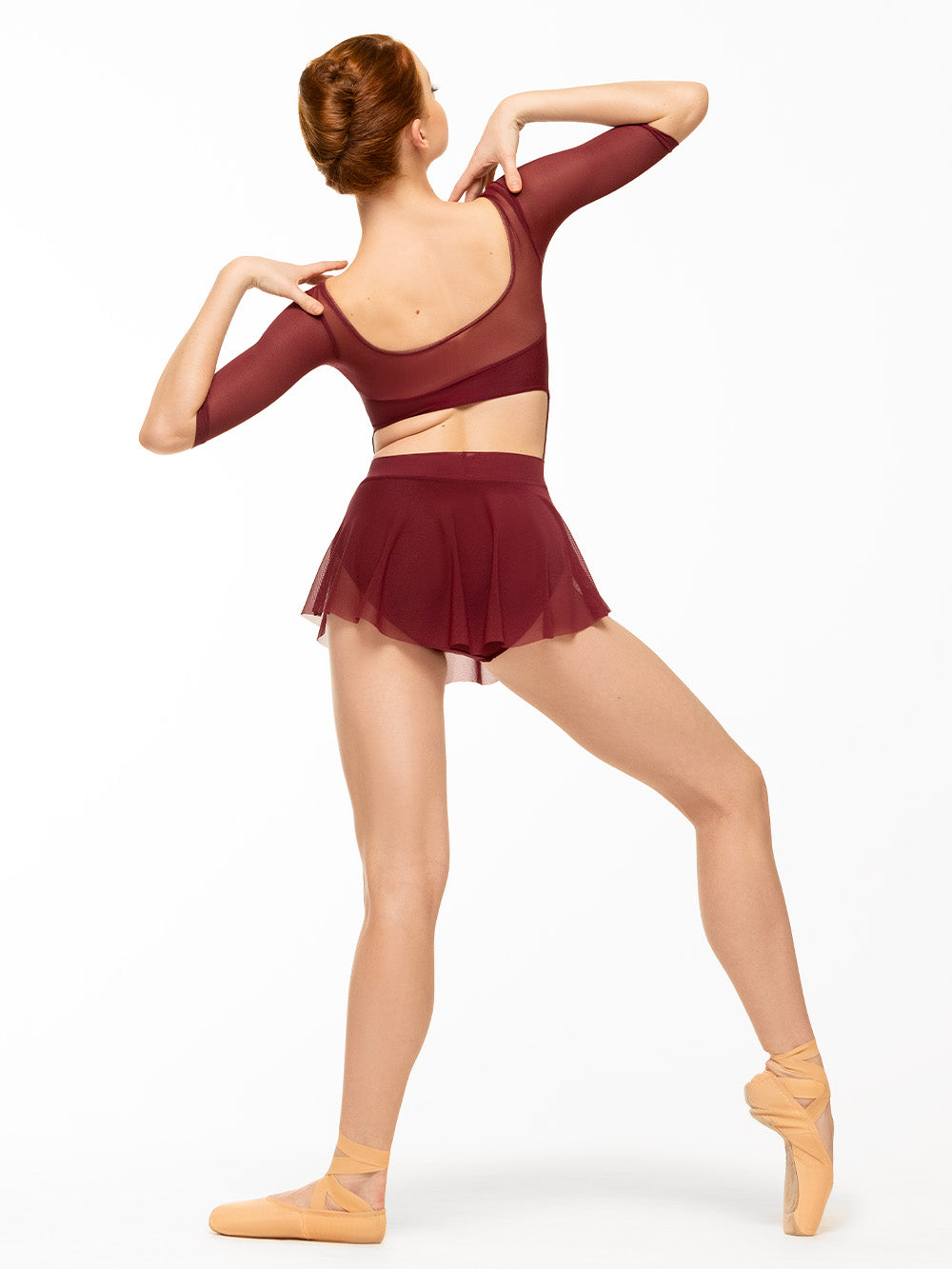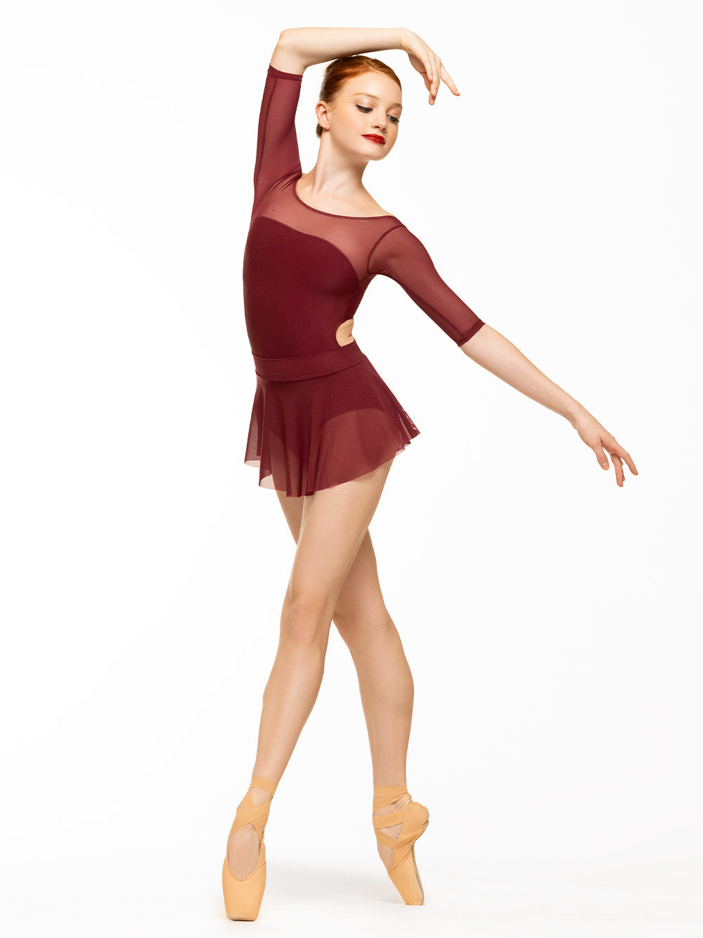 Model is wearing Laico Leotard Wine Kids RTW in size Adult X-Small with Hipster Skirt Wine Mesh Kids RTW.