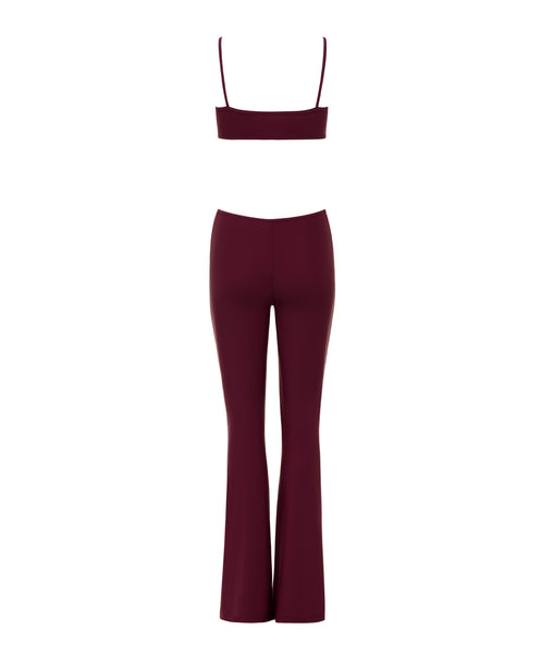 - Model is wearing Kiki Unitard Burgundy Wine RTW in size Adult X-Small featuring the Straight Leg option, RTW-exclusive Soft Burgundy Wine Base, Top, Collar, and Trim, and M-59 Black Mesh Middle.