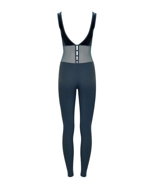 Sample Unitard 1 features the Straight Leg option. Sample Unitard 2 features the Kammi Leg option. Both samples feature S-50.4 Blue Agave Shiny Base, Top, Collar, and Trim and M-50.4 Blue Agave Mesh Middle.