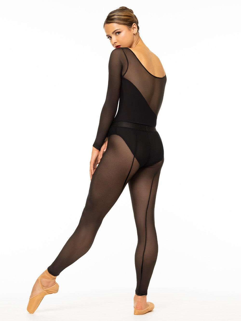 - Model 3 is wearing the Luna Leotard Black RTW Black Matte Base with M-59 Black Mesh Top Panels and To The Wrist Sleeves and Back Seam Tights Black Mesh RTW in adult size S.