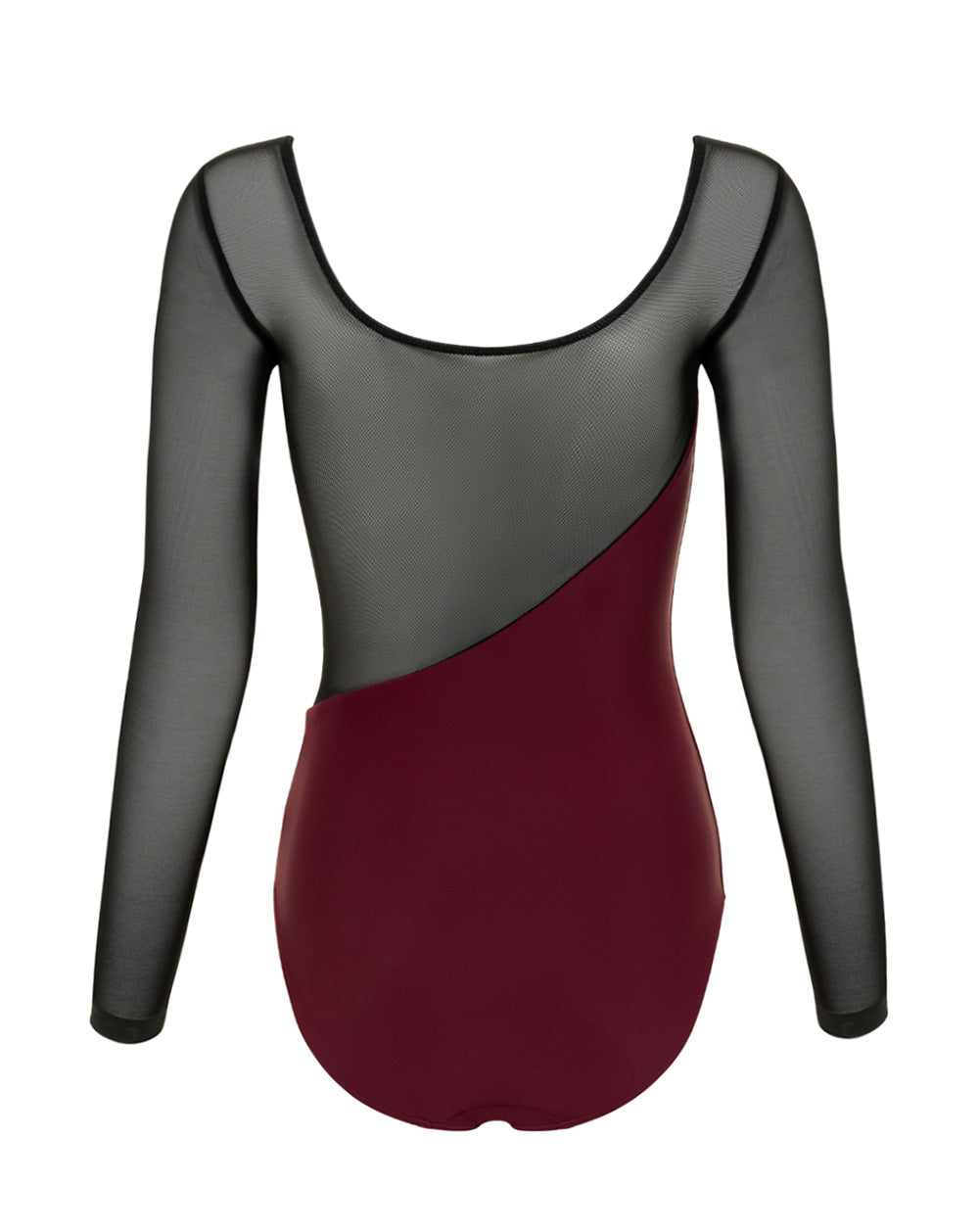 - Model 1 is wearing the Luna Leotard Wine RTW in adult size XS, featuring Wine Matte Base with M-59 Black Mesh Top Panels and To The Wrist Sleeves.