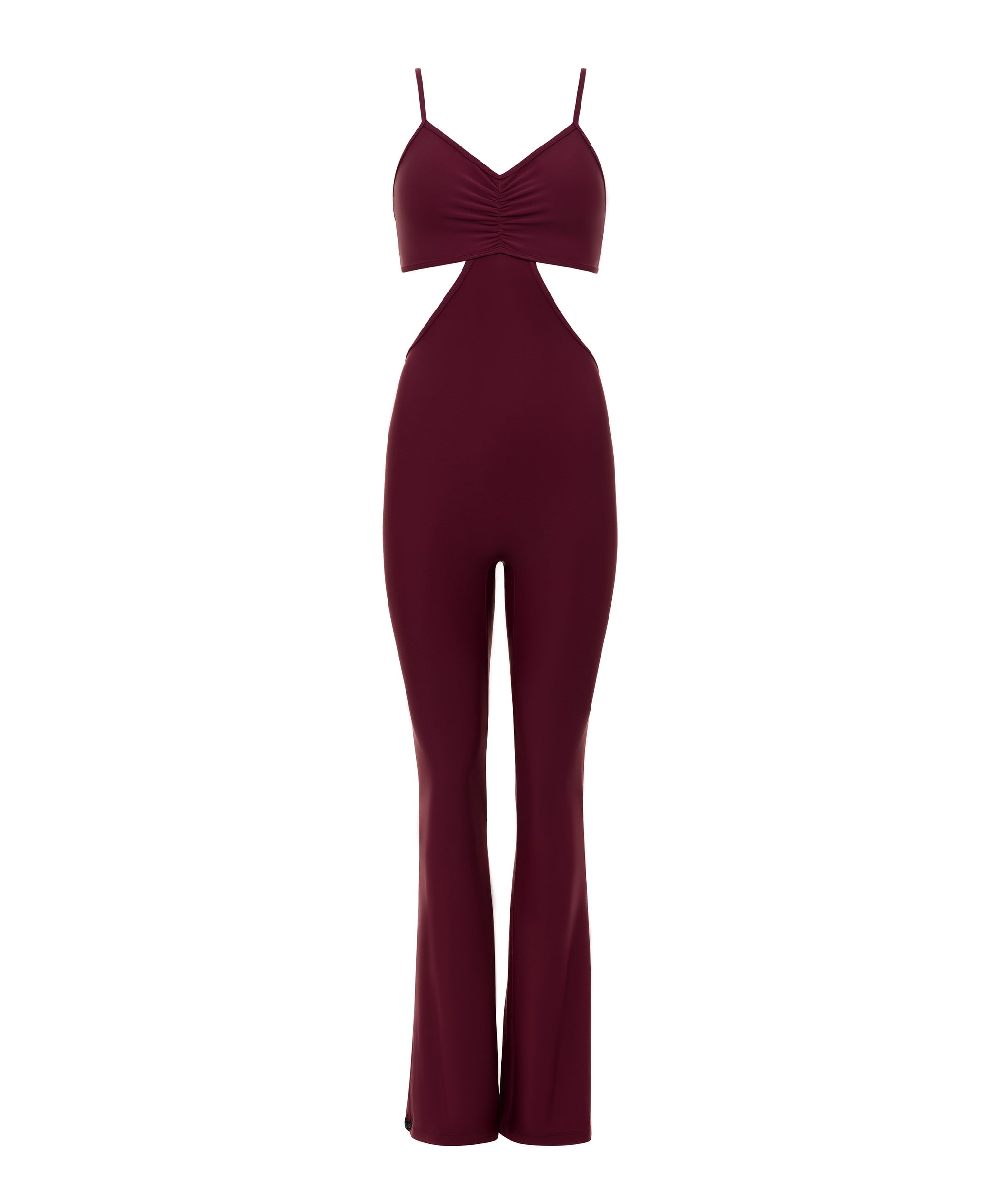 Our Sandy jumpsuit features a front pinch detail, cami straps, flare legs, and a waist-to-back cutout design.