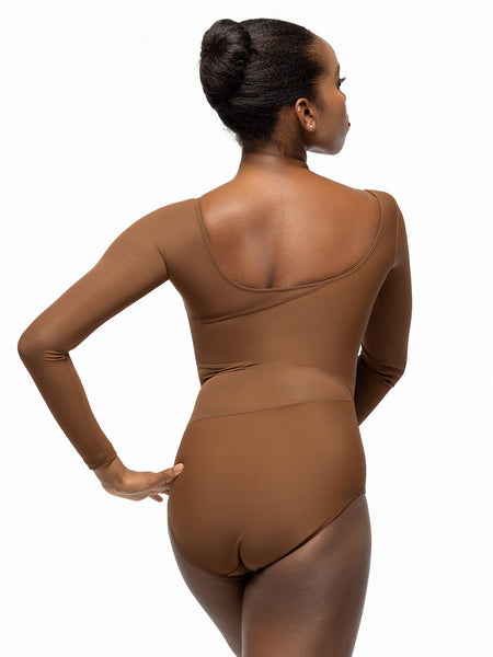 Model is wearing Short Dragonfly Skirt Mocha Mesh RTW in size Adult Medium with Maddie Mocha Leotard RTW.