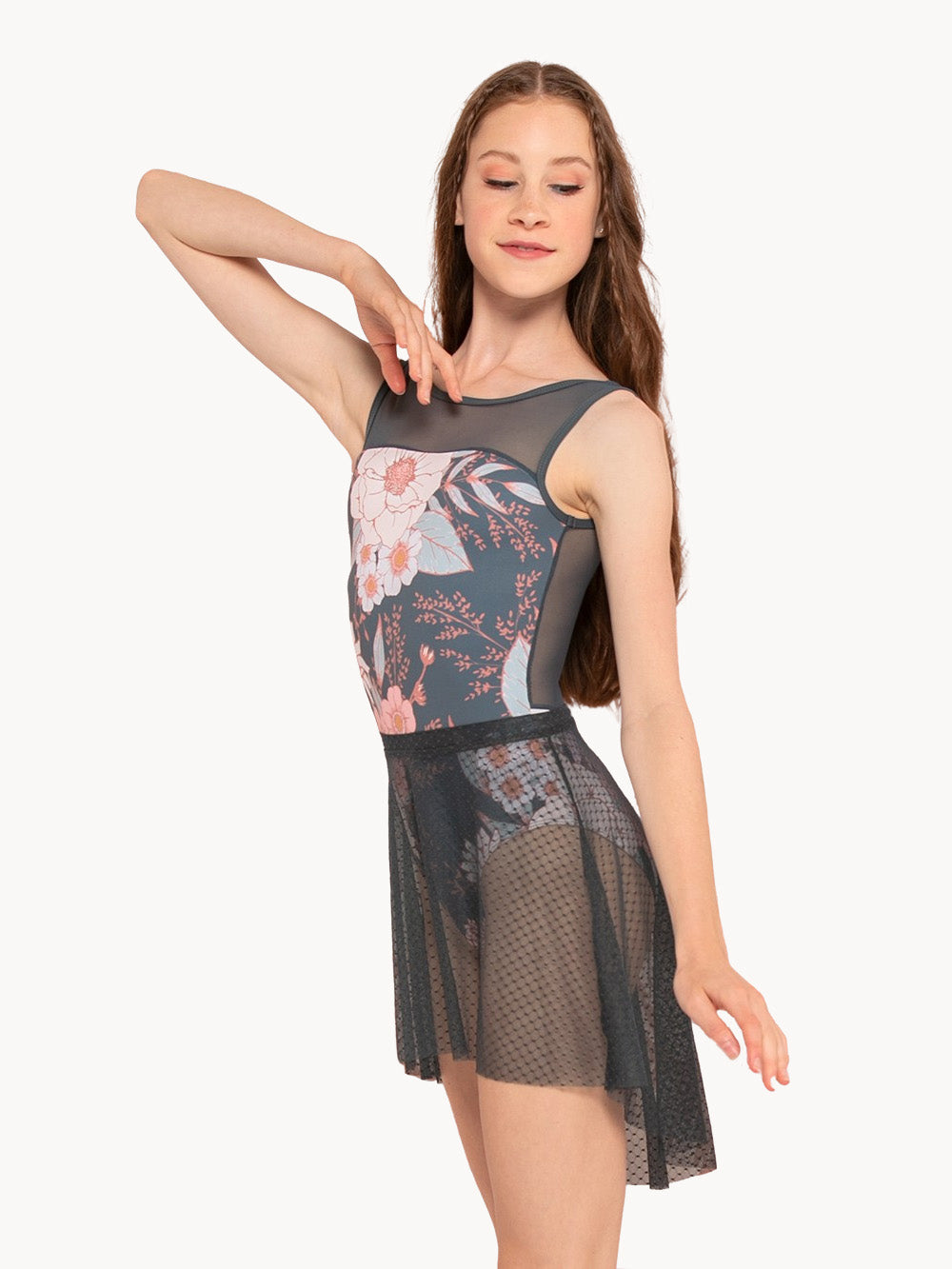 · Model 1 is wearing Short High-Low Skirt Symphony Diamond Mesh Kids RTW in size Adult X-Small with Stella Rhapsody Symphony Kids RTW.