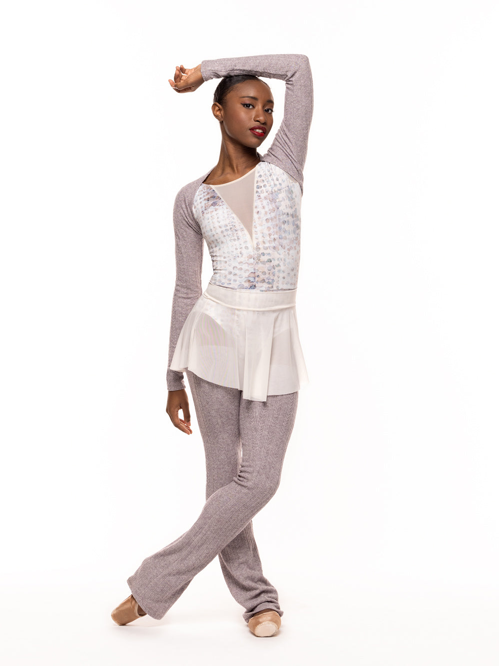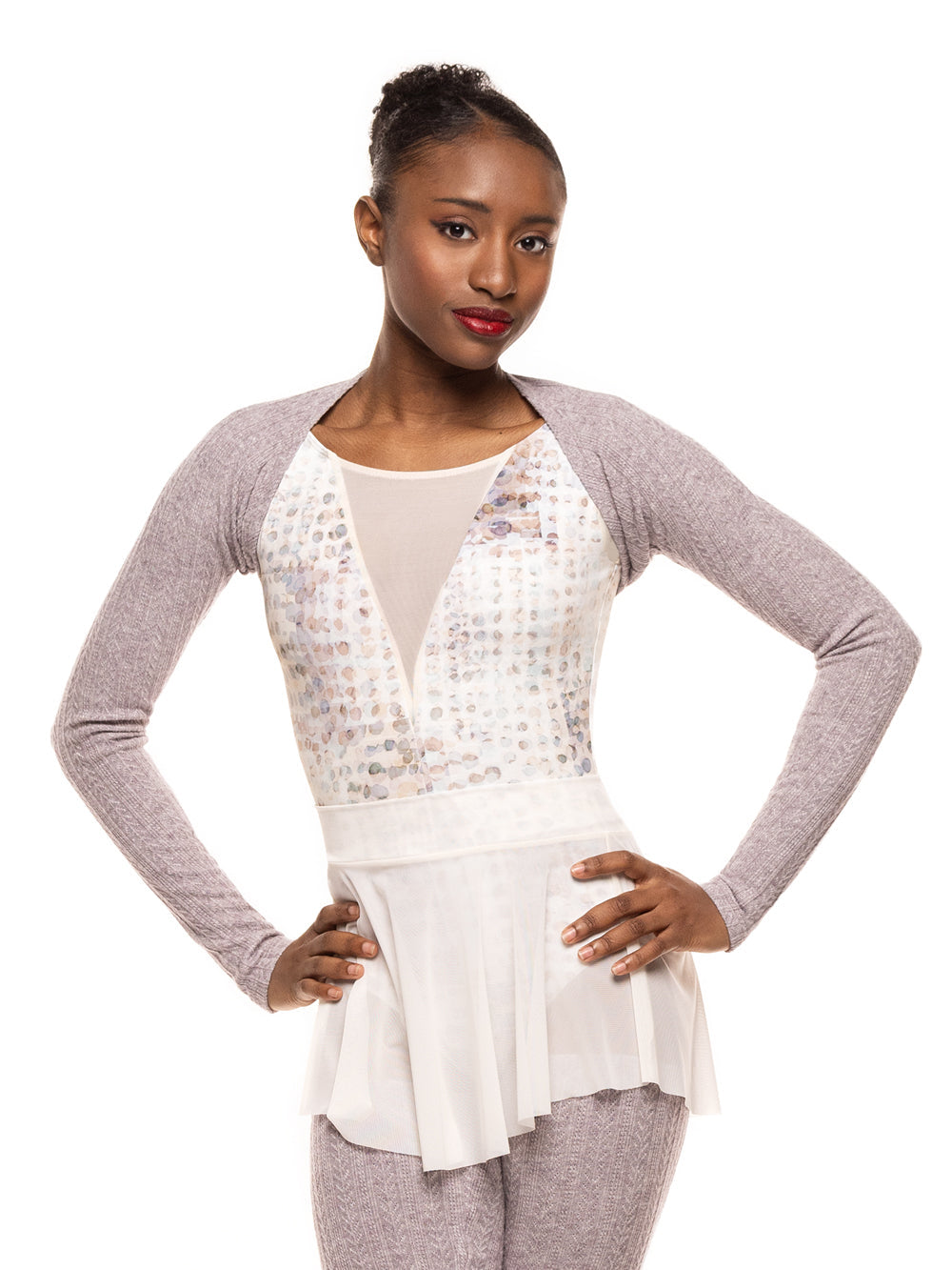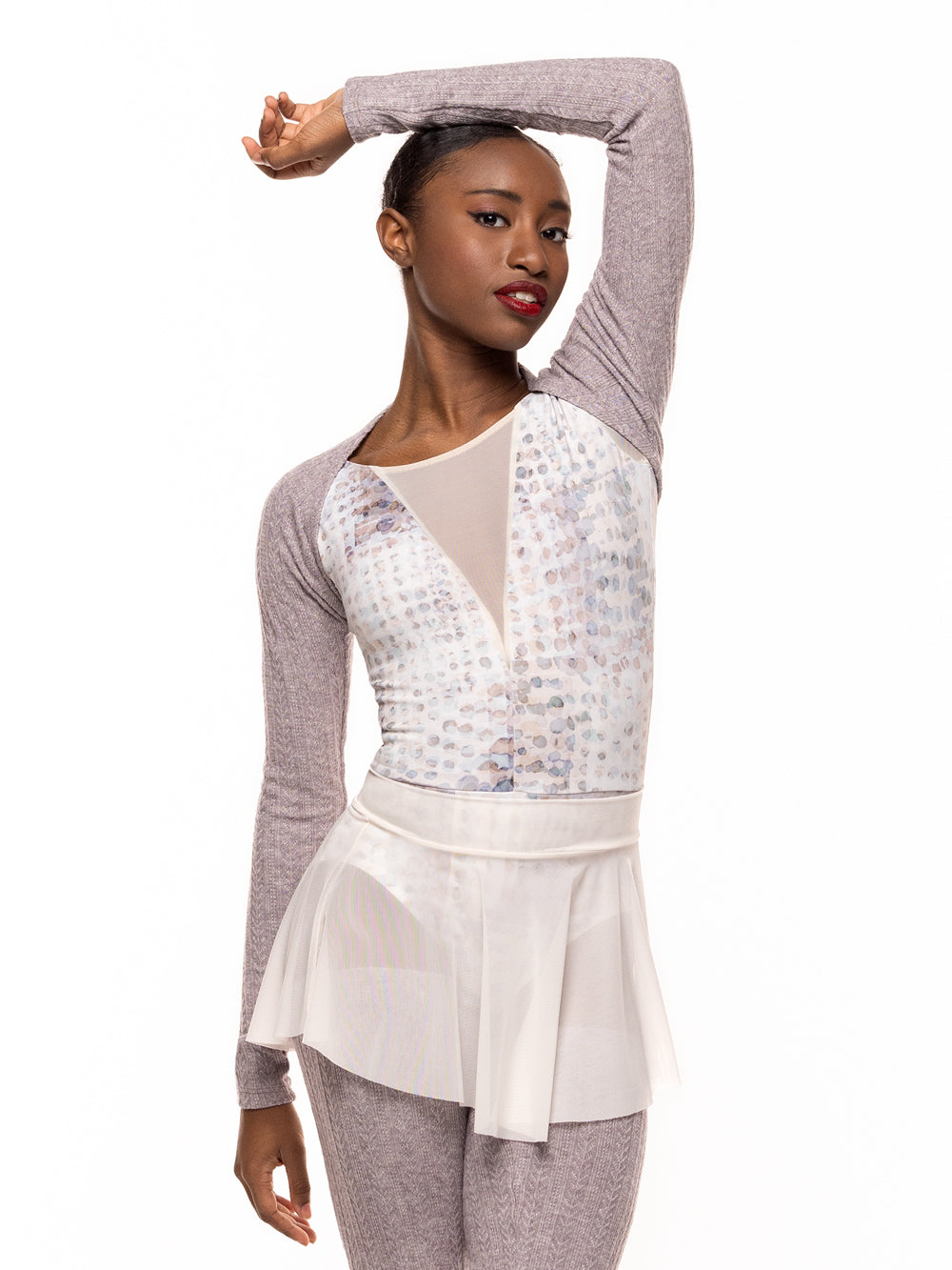 Model 1 is wearing leotard in Adult size XS and shrug and leg warmers in Adult size XS/S.