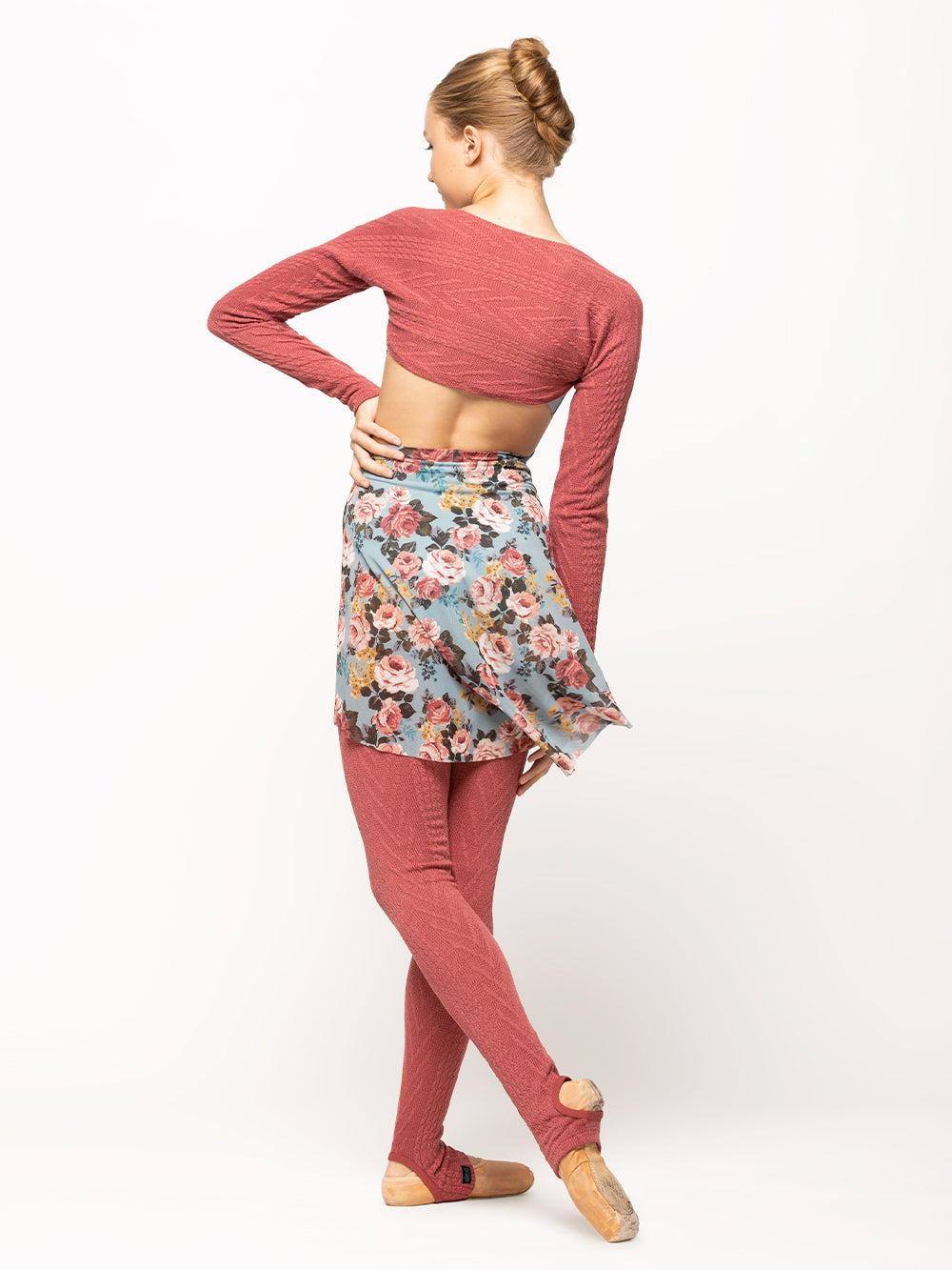 Model is wearing Stirrup Leg Warmers Long Knit Cinnamon Kids RTW in size Adult X-Small/Small with Jackie Misty Blue RTW, Mid High-Low Skirt Rhapsody Misty Blue Kids RTW, and Shrug Knit Cinnamon Kids RTW.