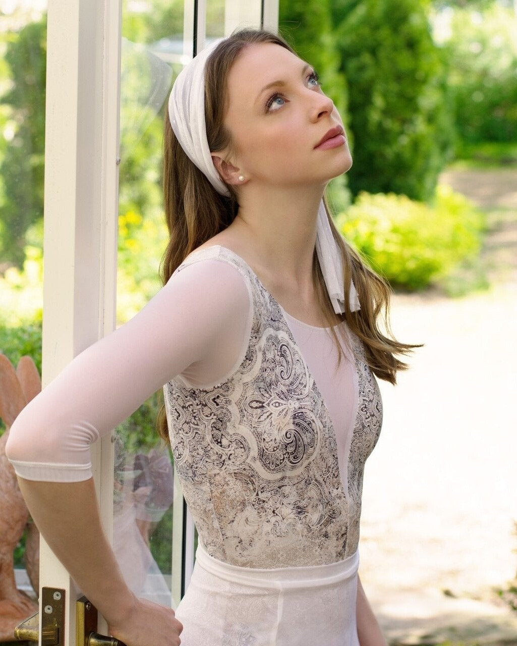 Tempe Arabesque is a muted and refined leotard essential for daydreaming. Tempe features an artistic bodice with White Mesh V-panels and above elbow sleeves.