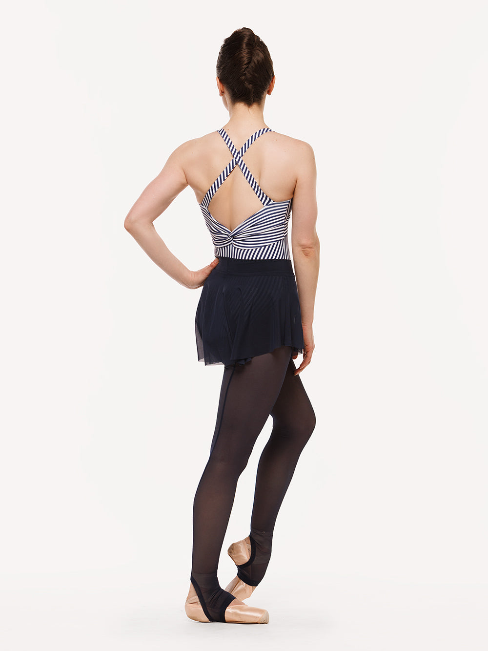 Model is wearing a leotard, skirt and tights in adult size M.