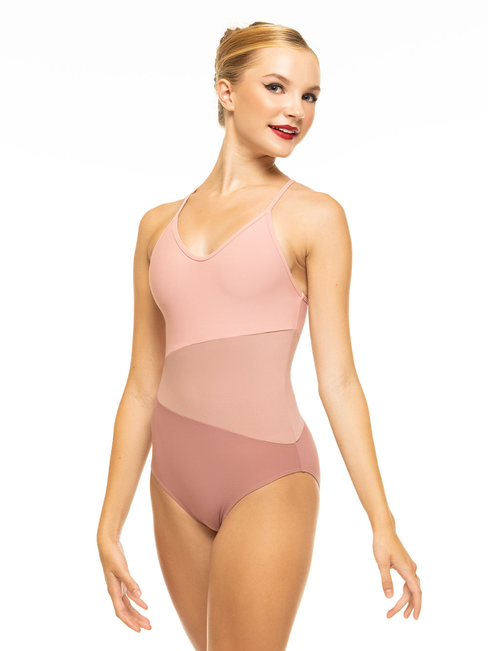 - Model 3 is wearing Tina Leotard Quartz RTW in size Adult X-Small featuring S-8.5 Rose Matte Top Front, Top Back and Trim, S-8 Dusty Rose Matte Middle, and S-8.2 Quartz Matte Base.
