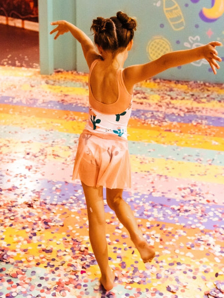 A bright Peach Mesh skirt to add a pop color to any look. We've paired it with our Nadine Kids Top Cat RTW, what will you pair it with?