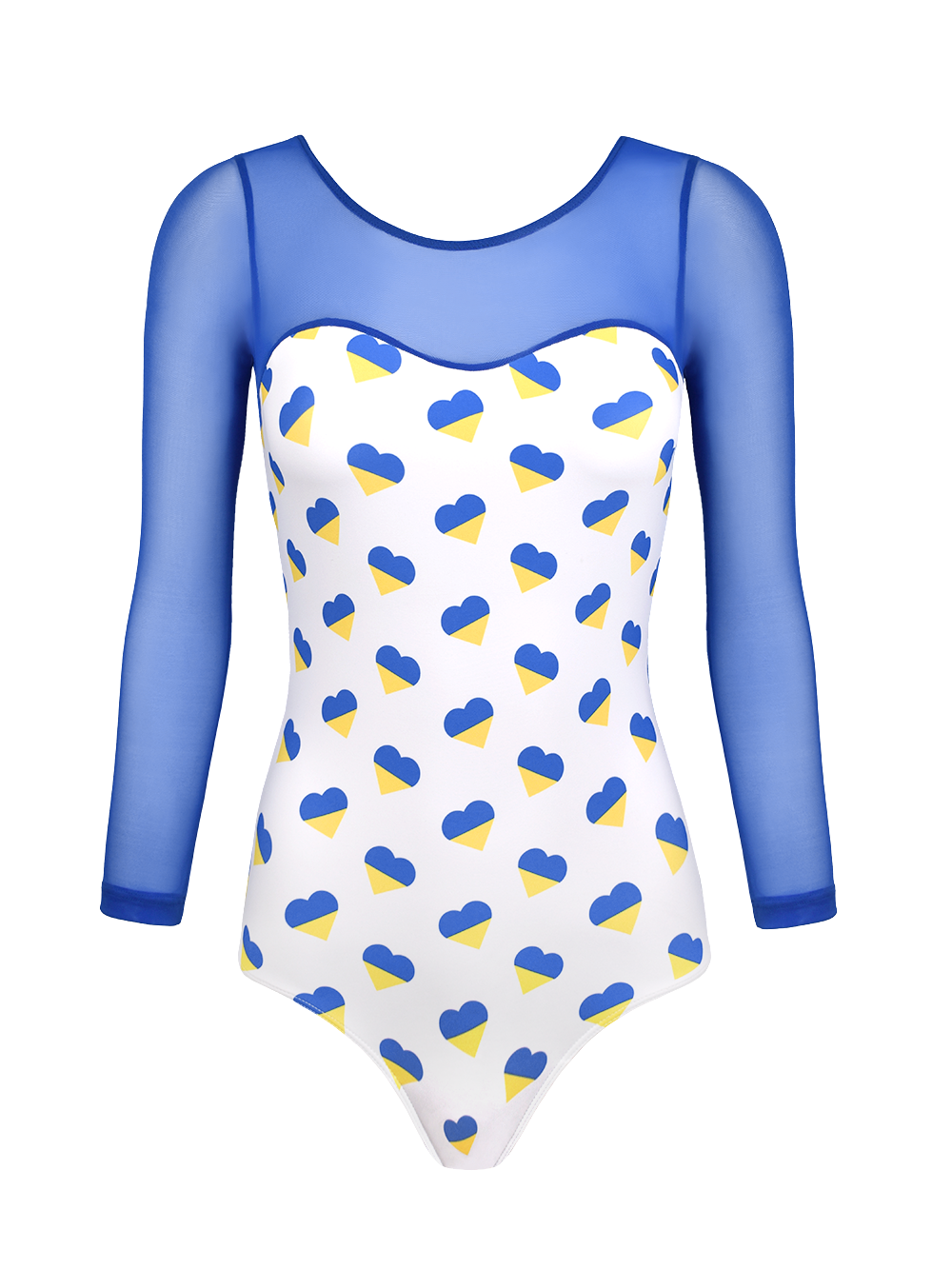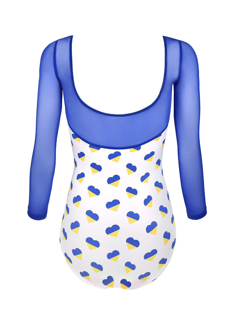 Sample features Royal Blue Mesh Top Front and Below Elbow Sleeves with Ukraine Hearts print Base.