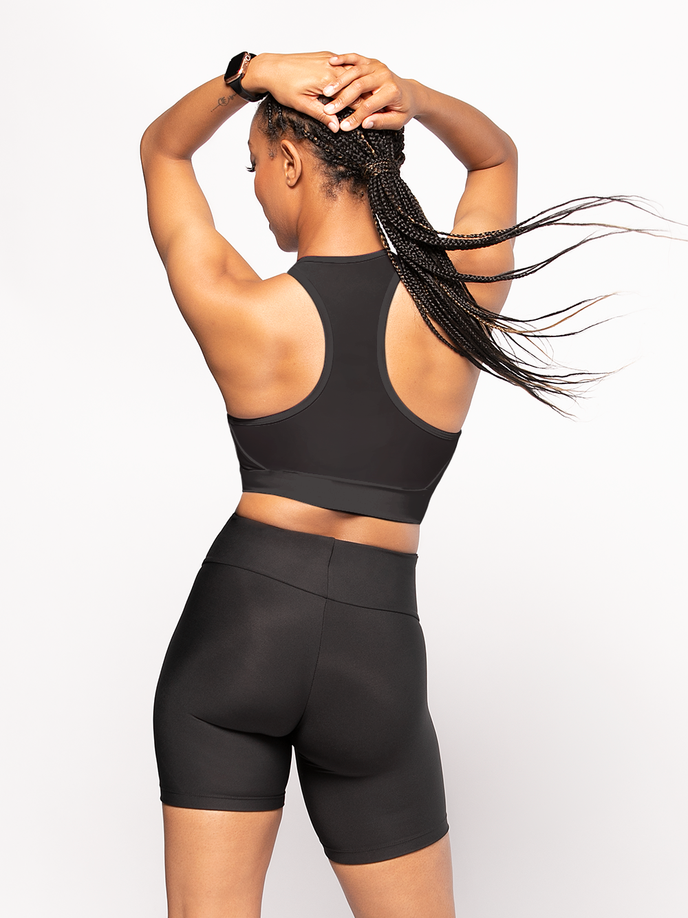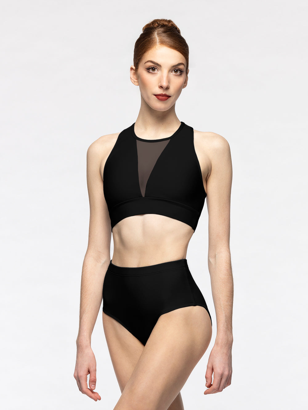 Model 1 and 2 are wearing Crop Top, Briefs, tights, and shorts in adult size S.