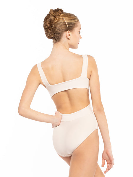 Model is wearing the Wrap Top First Crush with Iris Kids Cream Leotard RTW and Dramatic High-Low Skirt in First Crush Mesh RTW (adult sizes only) both in size S.